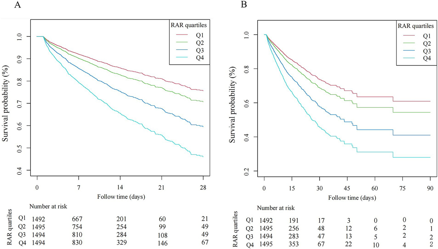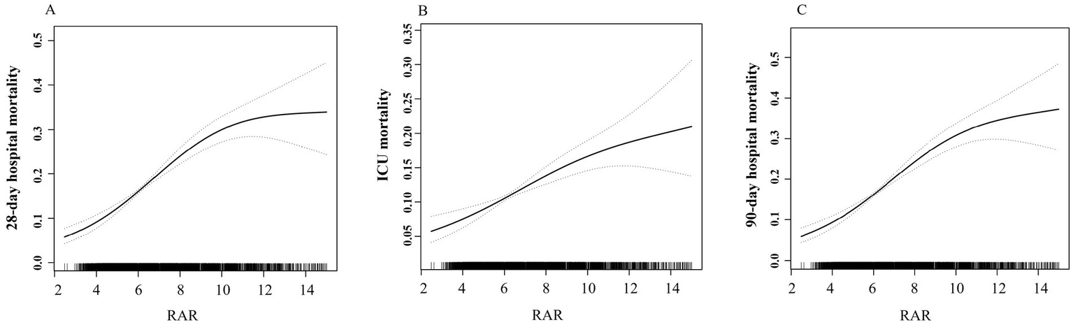 The 28-day hospital, ICU, and 90-day hospital mortality were 17.4, 10.9, 17.8%, respectively, with ICU and hospital stays of 2.9 (1.8–5.1) and 7.1 (4.6–11.7) days. Compared to Q1, Q4 exhibited significantly increased risks of 28-day hospital mortality (adjusted odds ratio [OR]: 2.95, 95% confidence interval [CI]: 2.28–3.80), ICU mortality (adjusted OR: 2.06, 95% CI: 1.52–2.78), 90-day hospital mortality (adjusted OR: 3.03, 95% CI: 2.35–3.90), and prolonged ICU (β: 0.89, 95% CI: 0.42, 1.36) and hospital stays (β: 1.64, 95% CI: 0.93, 2.36). Generalized additive model revealed linear relationship between RAR and mortality. Kaplan–Meier survival analysis demonstrated higher mortality with elevated RAR quartiles.