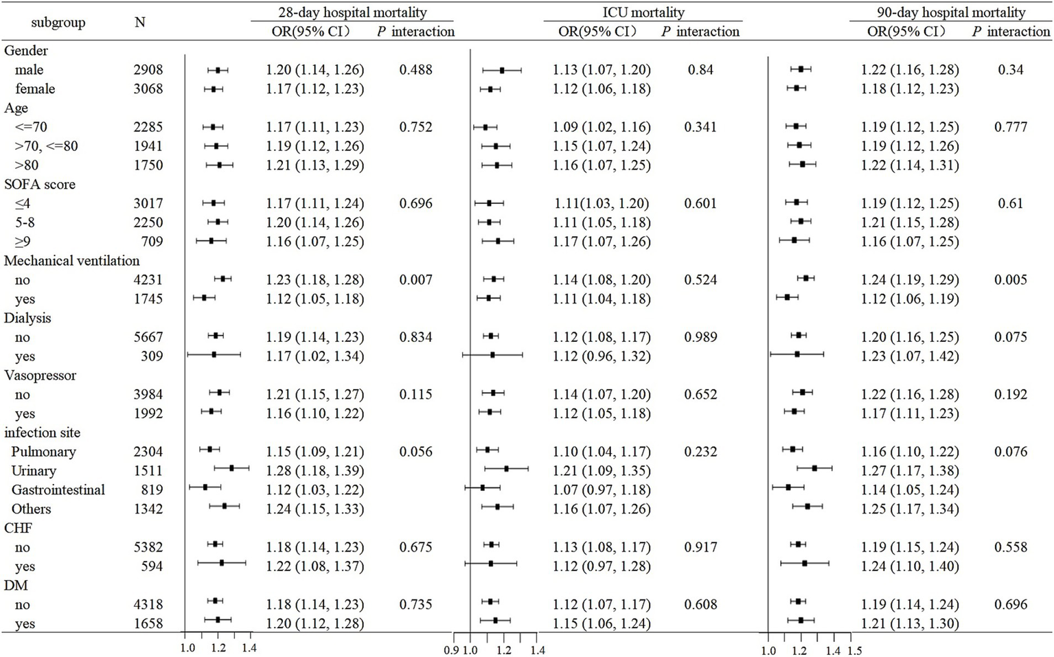 All statistical analyses were performed using EmpowerStats (X&Y Solutions, Inc., Boston, Massachusetts) and R software (version 4.2.0), with statistical significance defined as p < 0.05 (two-sided). Subgroup analyses were conducted using multivariable logistic regression, with stratification based on gender (male or female), age (≤70, 70–80, >80), SOFA score (≤4, 5–8, ≥9), mechanical ventilation (yes or no), dialysis (yes or no), vasopressor use (yes or no), infection site (pulmonary, urinary, gastrointestinal, others), CHF (yes or no), and DM (yes or no). Furthermore, three sensitivity analyses were conducted to evaluate the robustness of the primary findings. First, we performed a sensitivity analysis restricted to complete cases to mitigate potential bias arising from missing data. Secondly, to assess the potential impact of transfusions involving red blood cells, plasma, or human serum albumin on RAR, a sensitivity analysis was performed. This analysis excluded patients who had received any of the aforementioned transfusions within the 2 days preceding their admission to the ICU. Thirdly, to assess the potential effect modification by anemia on RAR, the cohort was stratified into two groups: anemia and non-anemia, based on the World Health Organization’s definition of anemia (26). We then conducted multivariable regression analyses for each group separatedly.