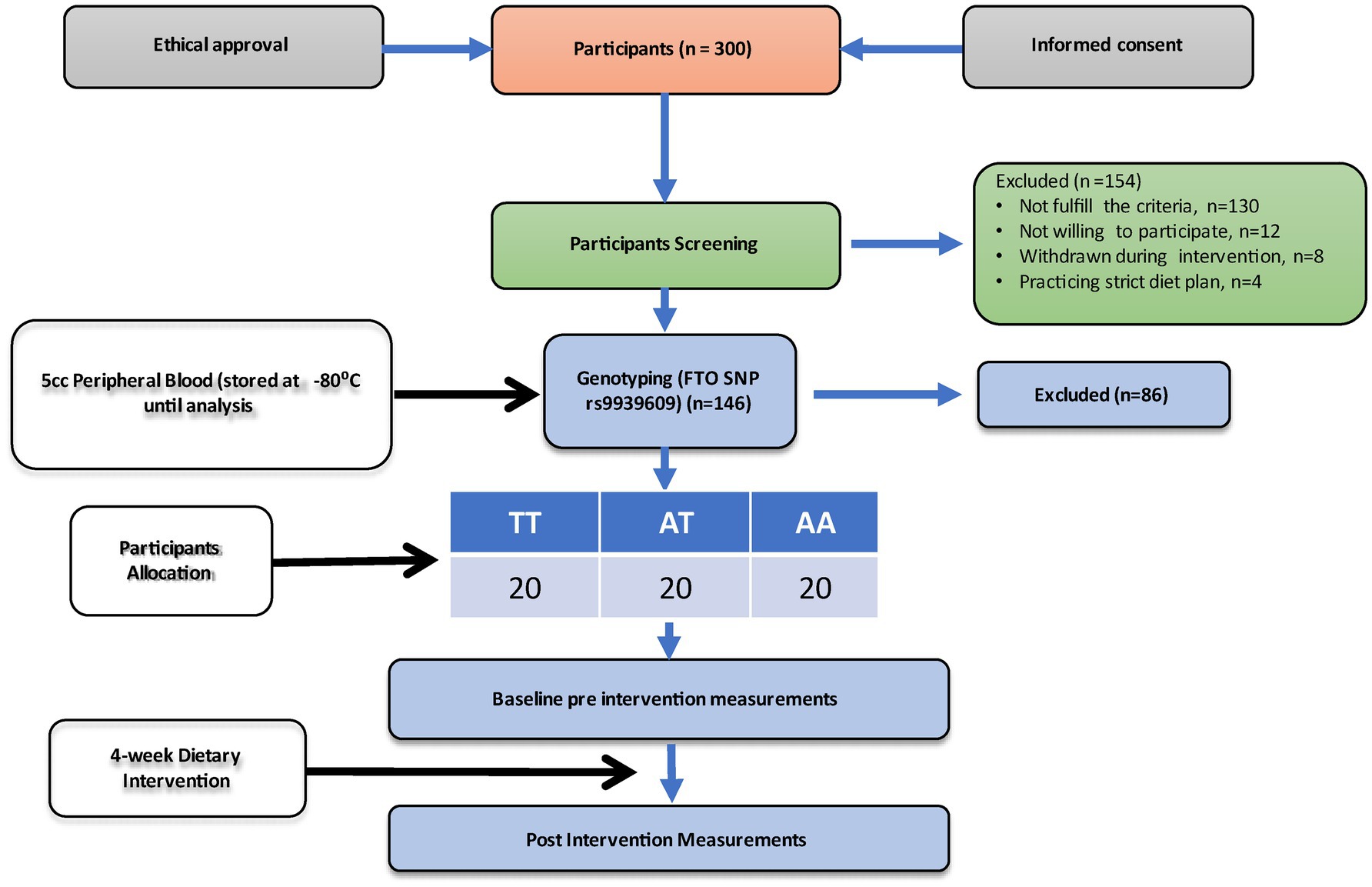 The overweight and obese participants recruited in this study were genotyped for the FTO gene polymorphism (rs9939609) using allele-specific PCR (Bio-Rad T100 Thermal Cycler). After genotyping, participants were categorized into three categories based on their genotypes into wild type allele (TT), homozygous for the minor allele (AA), and heterozygous allele (AT), respectively. A total of 60 participants were divided into three genotypes, i.e., (i) the wild type allele (TT; n = 20), (ii) homozygous for the minor allele (AA; n = 20), and (iii) heterozygous allele (AT; n = 20). All the groups received high high-protein (~100 g) and low-calorie (800 Kcal/day) diet for 4 weeks. Blood samples were taken at the start of the intervention (baseline) and after 4 weeks (endline). Figure 1 shows the experimental protocol.