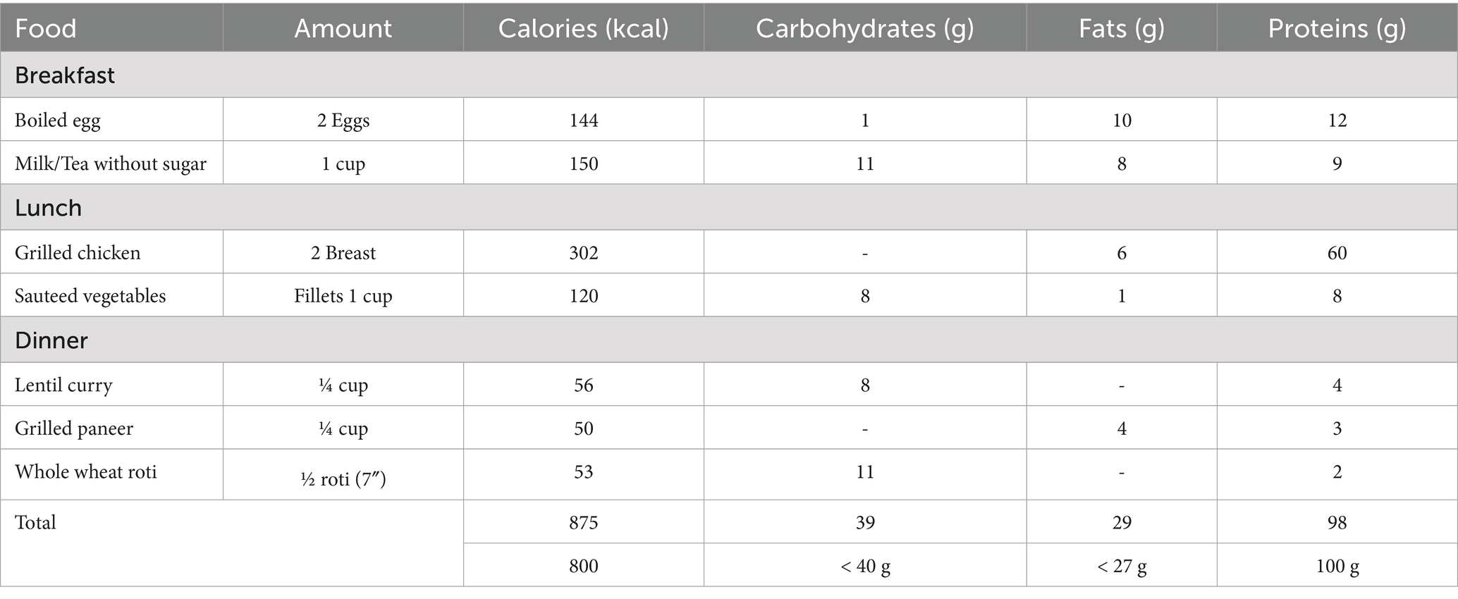 A high-protein, low-calorie diet (HPLCD) was given to individuals for 4 weeks. A daily meal of 800 kcal was designed with 40–60% of energy from proteins, <30% energy from fats, and <20% energy from carbohydrates. Meals were carefully prepared with appropriate quantities using kitchen measuring tools (cups, spoons, and a weighing scale) for each ingredient, following healthy cooking methods and hygiene. Meals were carefully packed in disposable meal boxes labeled with participant ID and day. All the participants were requested to receive their meals from the clinical trial unit kitchen, Khyber Medical University. Meals were delivered to some participants living far away.