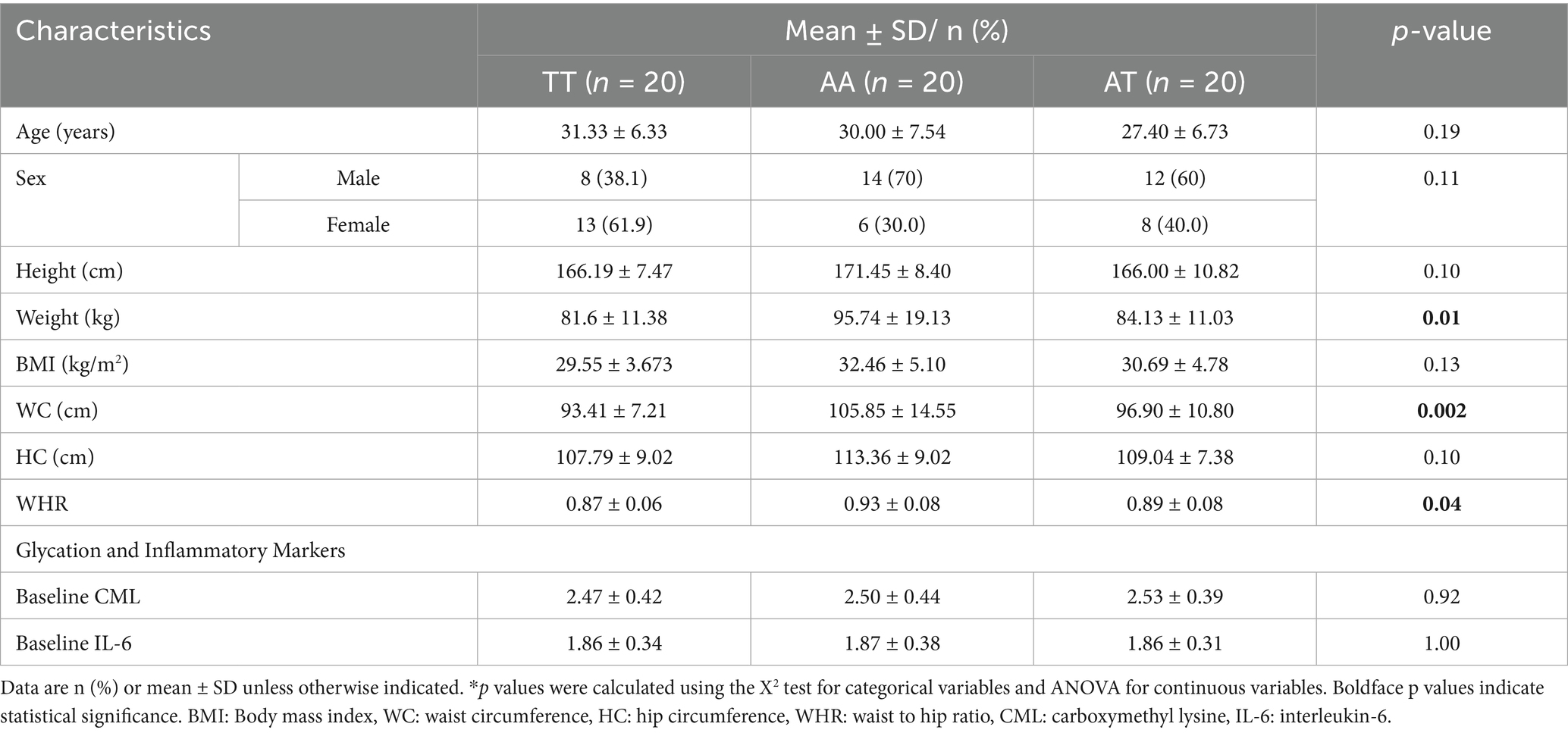 Therefore, consumption of a high-protein diet may be an effective approach for weight loss in individuals with the rs9939609 carriers of the FTO gene by lowering food cravings and appetite (38). While many nutrigenomic studies have focused on obesity, there has been much less research on the interaction between diet and SNPs in obesity, particularly in Pakistani populations. Therefore, this study aims to assess the potential impact of a high-protein low-calorie (HPLC) diet on anthropometric indices across different variants of the FTO gene in overweight and obese individuals. In addition, it explores the potential impact of a high-protein with low-calorie (HPLC) diet on CML and IL-6 across different variants of the FTO gene in overweight and obese individuals. IL-6 was selected as a primary endpoint because it integrates inputs from adipose inflammation, CML-RAGE activation, and dietary modulation. Its responsiveness to protein quantity makes it ideal for evaluating the inflammatory outcomes of our intervention.
