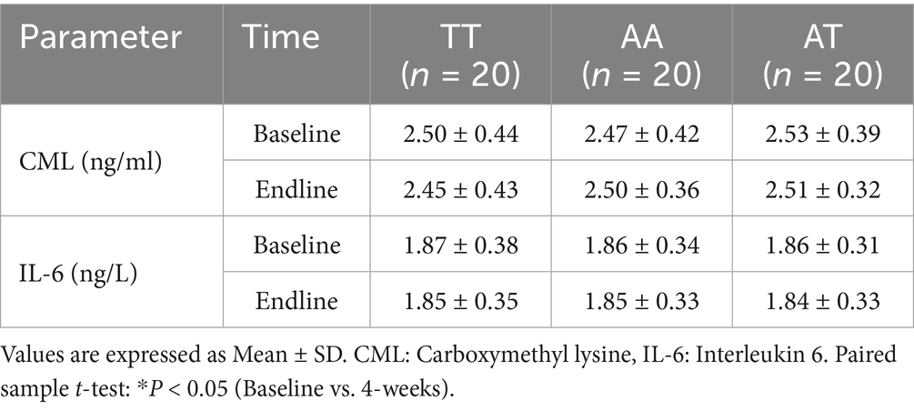 Table 5 shows changes in serum CML and IL-6 levels. At the end of the intervention, no significant (p > 0.05) changes were observed in CML and IL-6 among all three genotypes.