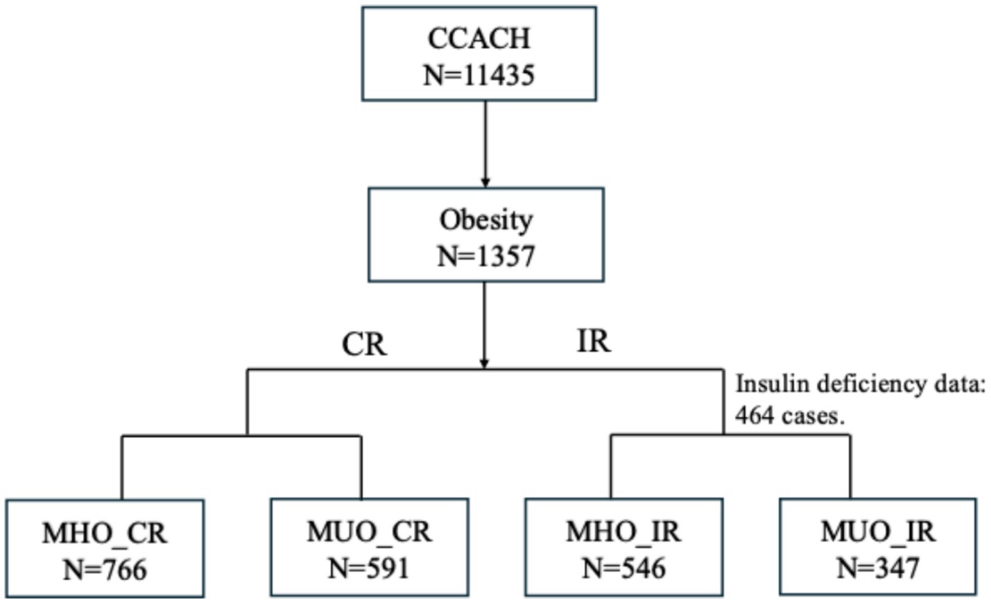 Figure 1. Sample selection flowchart of CCACH (2013–2015). Among the 1357 children with obesity, 893 were randomly selected to undergo measurement of insulin levels. CCACH, the China Child and Teenager Cardiovascular Health study; MHO, metabolically healthy obesity; MUO, metabolically unhealthy obesity; CR, cardiometabolic risk; IR, insulin resistance.