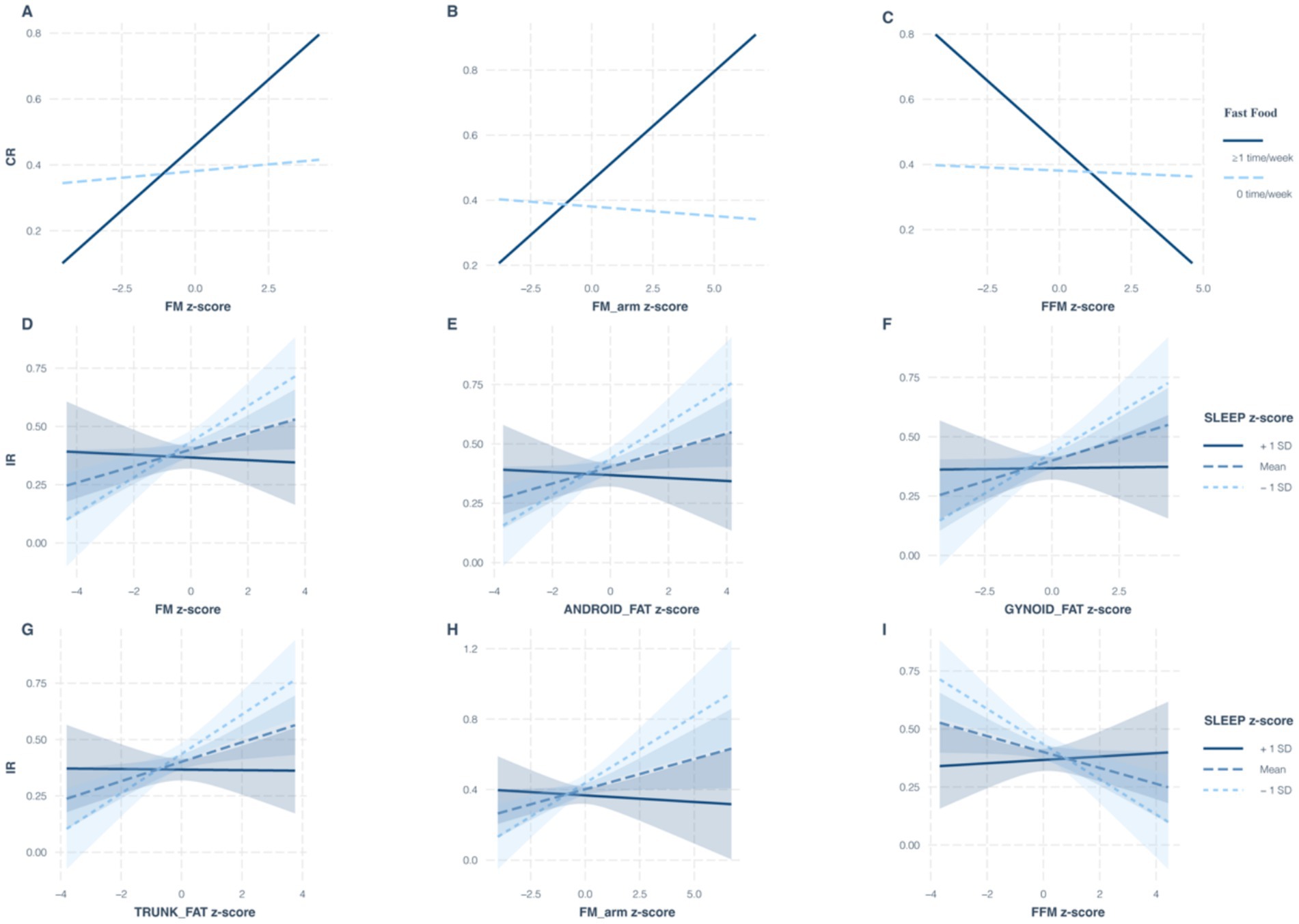 Figure 2. Influence of body composition and lifestyle interactions on the translation between MHO and MUO under different diagnostic criteria. Under the CR criteria, multiplicative interactions of fast food consumption with FM (A), arm FM (B), and FFM (C) on the MUO phenotype; under the IR criteria, multiplicative interactions of sleep duration with FM (D), android FM (E), gynoid FM (F), trunk FM (G), arm FM (H), and FFM (I) on the MUO phenotype. MHO, metabolically healthy obesity; MUO, metabolically unhealthy obesity; FM, fat mass; FFM, fat-free mass; CR, cardiometabolic risk; IR, insulin resistance.