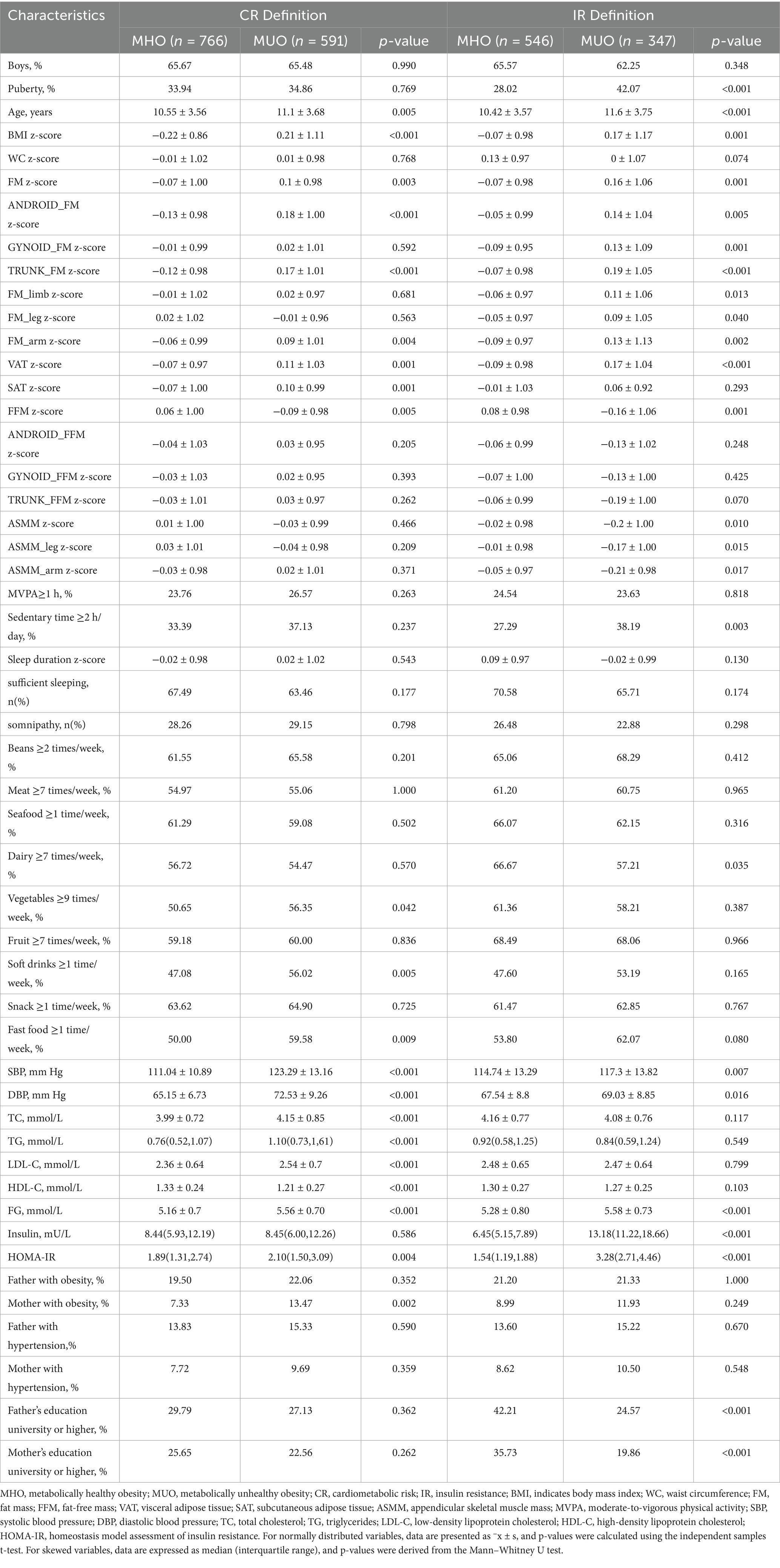 However, this study has several limitations. First, although we adopted a rigorous multicenter study design and stringent inclusion criteria, all participating centers were located in urban areas. This may limit the representation of rural populations and introduce selection bias. Second, regarding measurement, despite implementing standardized data collection procedures (e.g., using unified measurement tools and trained surveyors) to maximize data quality, potential measurement bias may persist due to inter-surveyor variability and subtle equipment differences. Third, although we adjusted for key confounding factors (e.g., age, sex, pubertal stage, and region) in our analyses, other confounders from unmeasured variables (e.g., gut microbiota composition, psychological or behavioral factors) could influence the results. Finally, as a cross-sectional study, our design was unable to infer causal relationships or depict the dynamic trajectories of MHO and MUO states over time. Emerging evidence suggests that MHO is a transient state, with the potential to progress to metabolically healthy non-obese phenotypes (33, 34). Therefore, future cohort studies should focus on clarifying their long-term stability and health impacts.