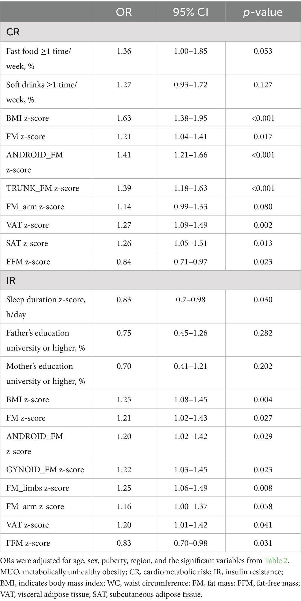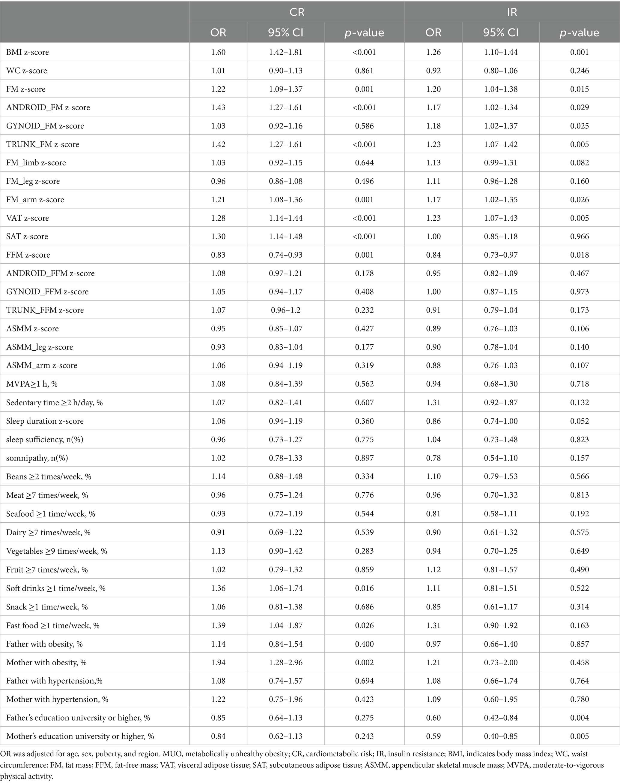 Methods: The study included 1,375 children with obesity, aged 6–19 years, from China. All participants underwent dual-energy X-ray absorptiometry (DXA) for the evaluation of body composition. Participants were classified as having MUO based on either insulin resistance (IR) or cardiometabolic risk (CR) factors (blood pressure, lipids, and glucose). The study also assessed the influence of body composition in conjunction with environmental factors, including lifestyle aspects and family medical history.