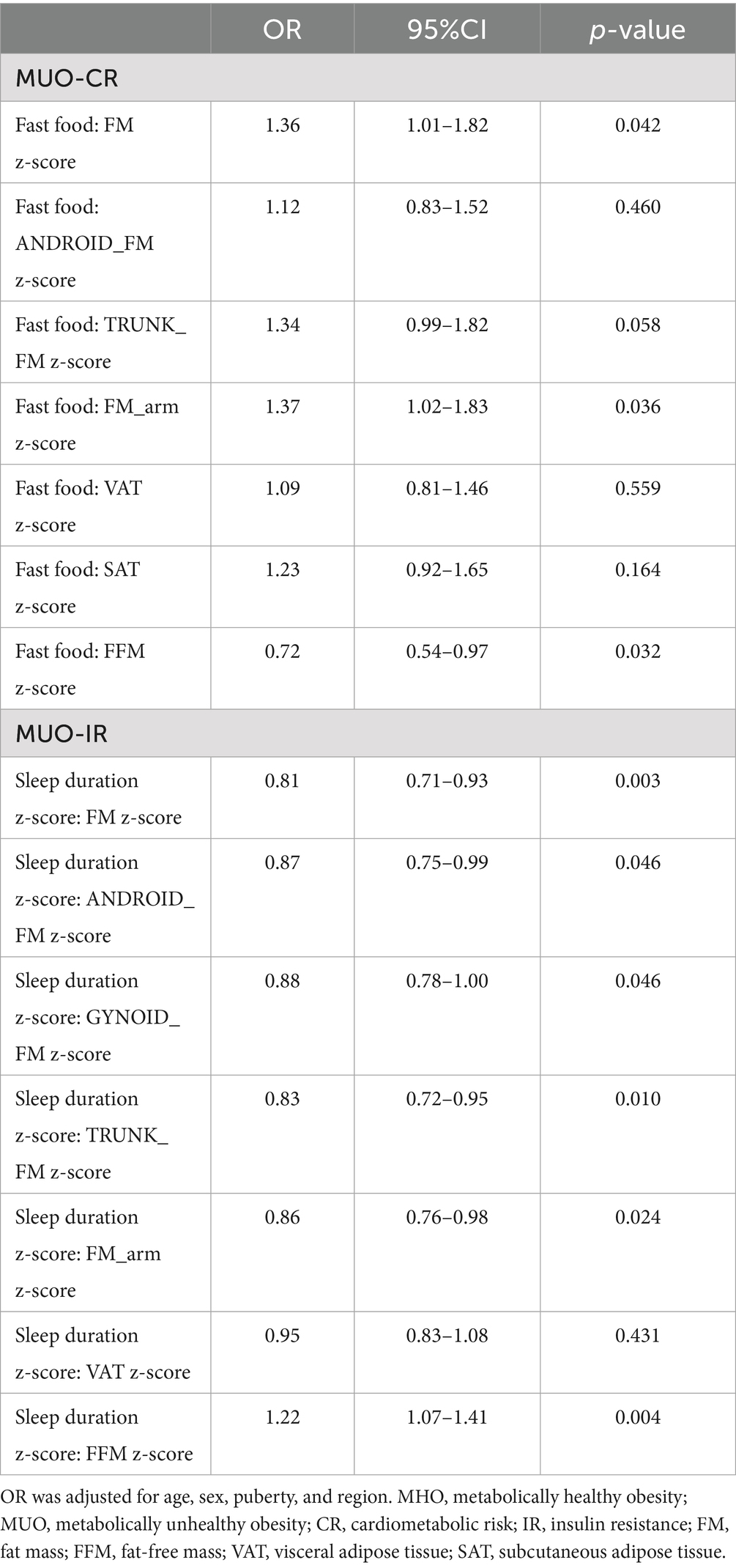 Through this large-scale population study of Chinese children and adolescents, we demonstrate that over half of individuals with obesity in this population exhibit relatively low CR or IR despite an elevated BMI. This finding underscores the clinical relevance of identifying MHO phenotypes. Second, multivariable analyses revealed that body composition factors—including FM, gynoid FM, and VAT—as well as lifestyle behaviors (e.g., frequent fast food consumption and inadequate sleep duration) were significantly associated with MUO phenotypes. Finally, significant multiplicative interactions between body composition and lifestyle factors were associated with MUO, suggesting that their synergistic effects may substantially influence metabolic health in children and adolescents with obesity. Although previous research has independently established associations between either body composition or lifestyle factors and metabolic health, few studies have simultaneously examined the integrated role of both in a pediatric cohort.