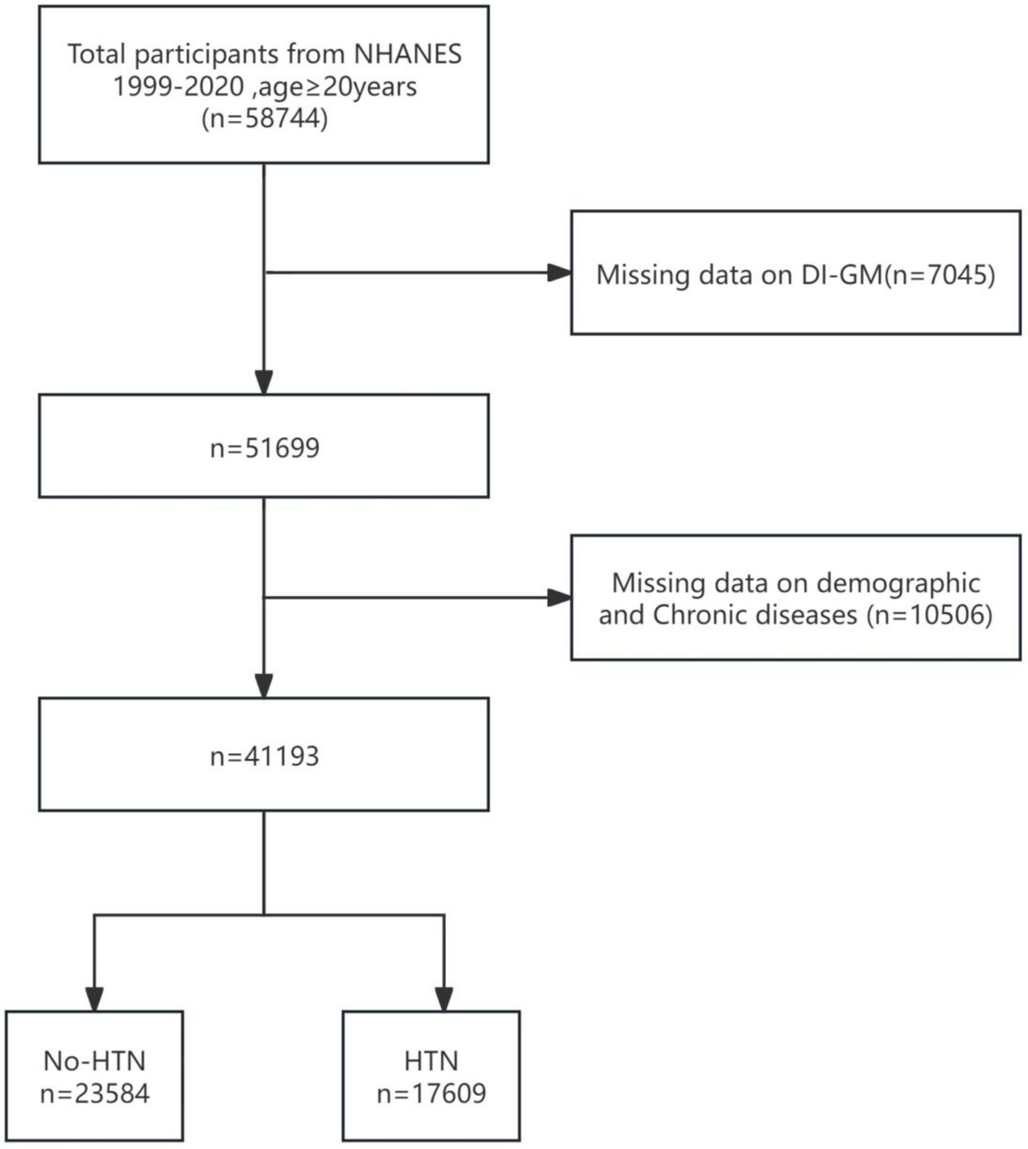Data were extracted from the National Health and Nutrition Examination Survey (NHANES) database, which annually surveys approximately 5,000 individuals nationwide. NHANES conducted 11 cycles of surveys between 1999 and 2020. NHANES has received ethical approval from the CDC’s research ethics review board [NHANES 1999–2004: Protocol #98–12; NHANES 2005–2010; Protocol #2005–06; NHANES 2011–2020: Protocol #2011–17, #2018–01 (Effective beginning October 26, 2017)]. NHANES ensures participant rights protection through informed written consent. For further details regarding the ethical review and consent procedures of NHANES, please refer to https://www.cdc.gov/nchs/nhanes/. The inclusion criteria for our study were as follows: adults aged 20 years or older with complete data on hypertension and the Dietary Intake Index for Gut Microbiota (DI-GM) (see Figure 1). A total of 41,193 individuals satisfied these criteria and were included in the analysis.