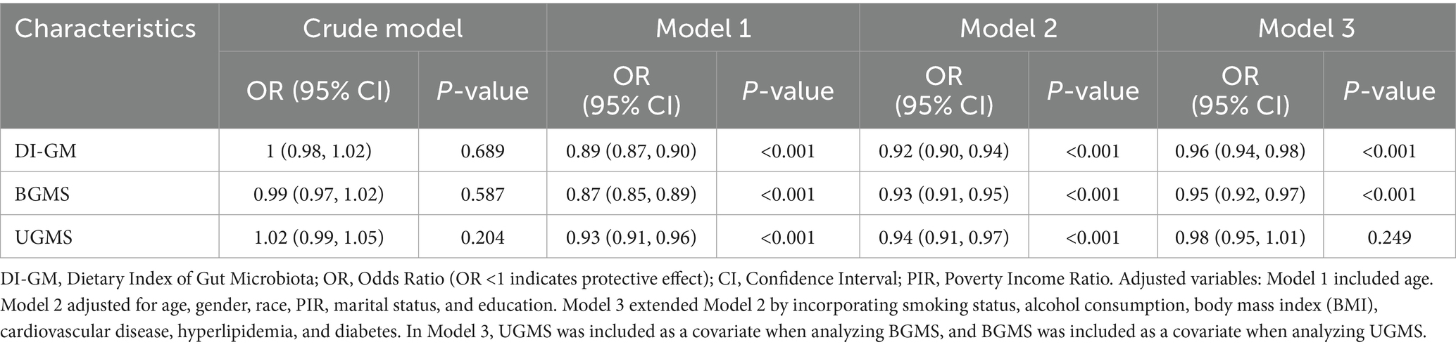 Aging is a major independent risk factor for the development of hypertension. Epidemiological data from the Framingham Heart Study in the United States indicate that individuals aged 55–65 have a lifetime risk of developing hypertension as high as 90%. Among those aged 65–89, 87% of men and 93% of women with hypertension exhibit isolated systolic hypertension (33). Baseline analyses reveal that without adjustment for confounding factors such as age, the associations between DI-GM, BGMS, and UGMS and hypertension do not achieve statistical significance. However, in the multivariate weighted logistic regression model (Model 1), after adjusting solely for age, DI-GM and BGMS demonstrate significant statistical associations with hypertension (p < 0.001). Further subgroup analyses show that regardless of whether groups are divided at the age boundary of 35 (<35 years vs. ≥35 years), DI-GM and BGMS exhibit significant protective effects against hypertension.
