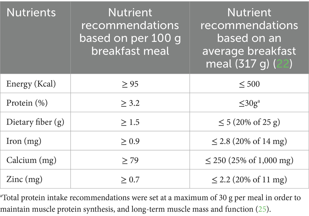 Dietary intake values were determined using the International Breakfast Initiative nutrient proposal for a breakfast meal in Western Europe and North America to determine an ideal contribution of nutrients from plant protein foods in a plant-based meal (22). Breakfast was used as an example meal for several reasons, including the availability of nutrient guidance for this meal and the daily energy intake recommendations being generally lower for breakfast, allocating 20–25% of total intake thus allowing for adaptation based on individual snacking habits (23). The average-sized breakfast of 317 g was determined by assessing the 20 breakfast recipes listed under the International Breakfast Initiative (24). As shown in Table 4, the range for each nutrient constraint was determined based on nutrient recommendations per 100 g breakfast to an average-sized breakfast of 317 g. As protein intake is a driving factor for optimal protein quality, the total protein intake recommendations were set at a maximum of 30 g per meal to maintain muscle protein synthesis and long-term muscle mass and function (25).