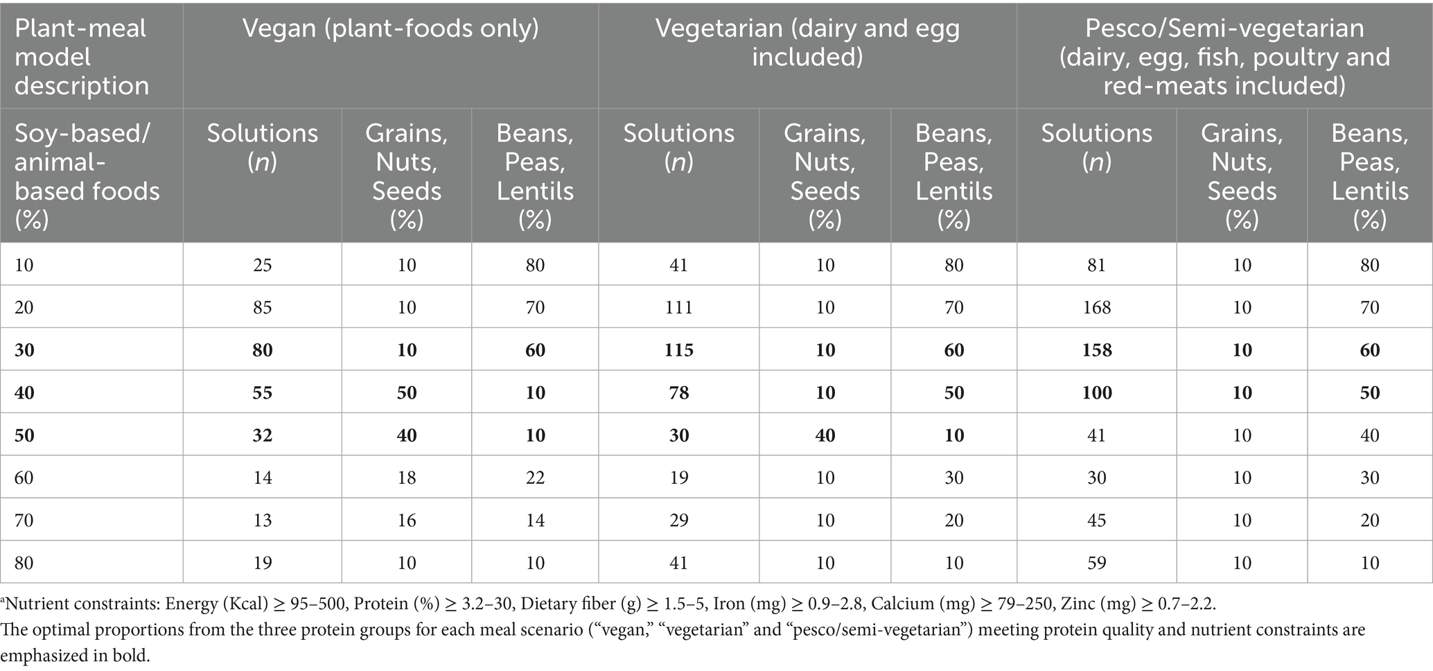 This study’s vegan and vegetarian meal solutions included a variety of plant protein foods within grains, nuts, seeds, beans, peas, and lentils, unlike the pesco/semi-vegetarian meals, including fish, poultry, and red meats. The increased variety could be due to the need for various plant protein foods to address the limiting amino acids in different plant proteins (38, 39). In contrast, when animal protein foods such as fish, poultry, and red meats were added to the pesco/semi-vegetarian meal model, the optimal ratios differed, with a higher percentage coming from beans, peas, and lentils. Such differences could be due to the constraints on nutrients such as dietary fiber, iron, and calcium in the optimization model. To meet the nutrient constraints included in the optimization model for proposing protein ratios in meals containing animal protein foods such as dairy, eggs, fish, poultry, and red meats, which are high in iron and calcium but lack dietary fiber, the solution was increasing the proportion of beans, peas, and lentils. This solution aims to compensate for the absence of dietary fiber in animal foods while maintaining high protein quality in a meal.
