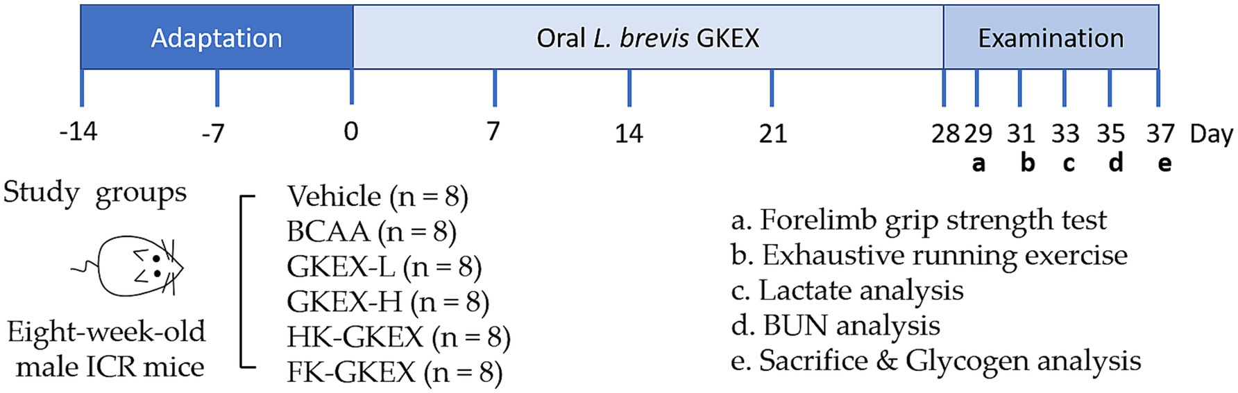 Eight-week-old male ICR mice with an average weight of approximately 30 g were sourced from BioLASCO Taiwan (Yi-Lan Breeding Center, Yi-Lan, Taiwan). The Institutional Animal Care and Use Committee of the National Taiwan Sport University (IACUC of NTSU) approved (IACUC-11108) all animal experiments conducted. All animals were provided LabDiet® 5,001 (PMI Nutrition International, Purina Mills, MO, United States) and distilled water ad libitum. The room temperature was maintained at 24 ± 2 °C with a humidity of 65 ± 5% and a 12-h light–dark cycle. A 2-week acclimation period was provided during which the mice were subjected to adaptive training to minimize stress and familiarize them with treadmill use. The adaptive training protocol consisted of placing the mice on a stationary treadmill on days 1–3, followed by light running at a speed of 5–10 m/min for 10 min/day from days 4 to 7, with gradual increases in duration and intensity over the second week to prepare them for later endurance testing. A total of 48 mice were randomly divided into 6 groups, with each group containing 8 mice: vehicle (water only) and branched-chain amino acids (BCAA, positive control, 1,500 mg/day (14)). Feeding doses of different preparations of L. brevis GKEX groups in mice were based on the human-to-mouse conversion factor of 12.3 (15): low-dosage L. brevis GKEX (GKEX-L) (0.0615 mg/day, equivalent to 10 mg/day in a human with 60 kg), high-dosage L. brevis GKEX (GKEX-H) (0.615 mg/day, equivalent to 100 mg/day in a human with 60 kg), HK-GKEX (0.615 mg/day, equivalent to 100 mg/day in a human with 60 kg), and FK-GKEX (0.615 mg/day, equivalent to 100 mg/day in a human with 60 kg). During the animal experiment, L. brevis GKEX was administered daily at 9 a.m. via oral gavage for four consecutive weeks. Throughout this period, the body weight, food intake, and water consumption were recorded. The intensity of exercise was gradually increased from low to high in consideration of animal welfare. Endurance fatigue analysis was conducted on days 29 to 37 of the experiment. This included analysis of forelimb grip strength, an exhaustive running test, post-exercise blood lactate and blood urea nitrogen (BUN) concentrations, as well as liver and muscle glycogen content. The experimental procedure is shown in Figure 1.