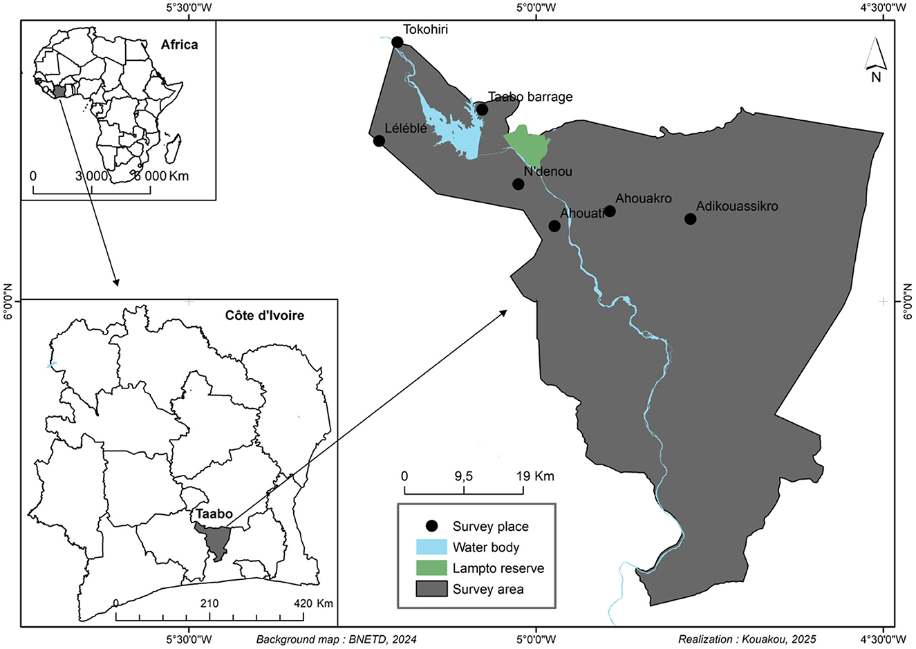 Figure 2. Map showing the study area in south-central Côte d'Ivoire within the Taabo Health and Demographic Surveillance System (HDSS).