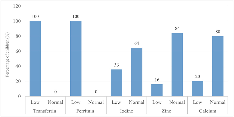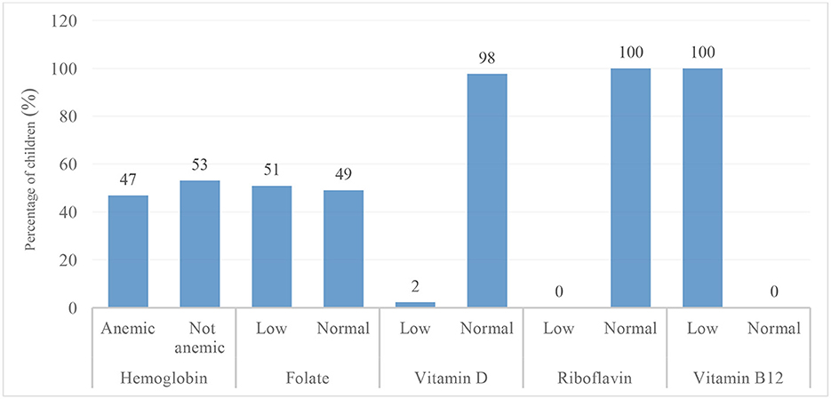 The assessment of nutritional status using anthropometric indicators WAZ, HAZ, and BAZ showed that the majority of participants were within the normal range: 88.7% for WAZ, 85.1% for HAZ, and 90.0% for BAZ (Table 1). The prevalence of underweight (7.9%), stunting (7.6%), and thinness (9.2%) was relatively low, resulting in an overall undernutrition prevalence of 24.7%. For micronutrient status, the majority of the children had low blood concentrations of folate (51%), thiamine (100%), vitamin B12 (100%), ferritin (100%), and transferrin (100%). In contrast, most children had values within the normal range for vitamin D (98%), vitamin B3 (100%), zinc (84%), iodine (64%), calcium (80%), and hemoglobin (53 %), as shown in Figures 3, 4.