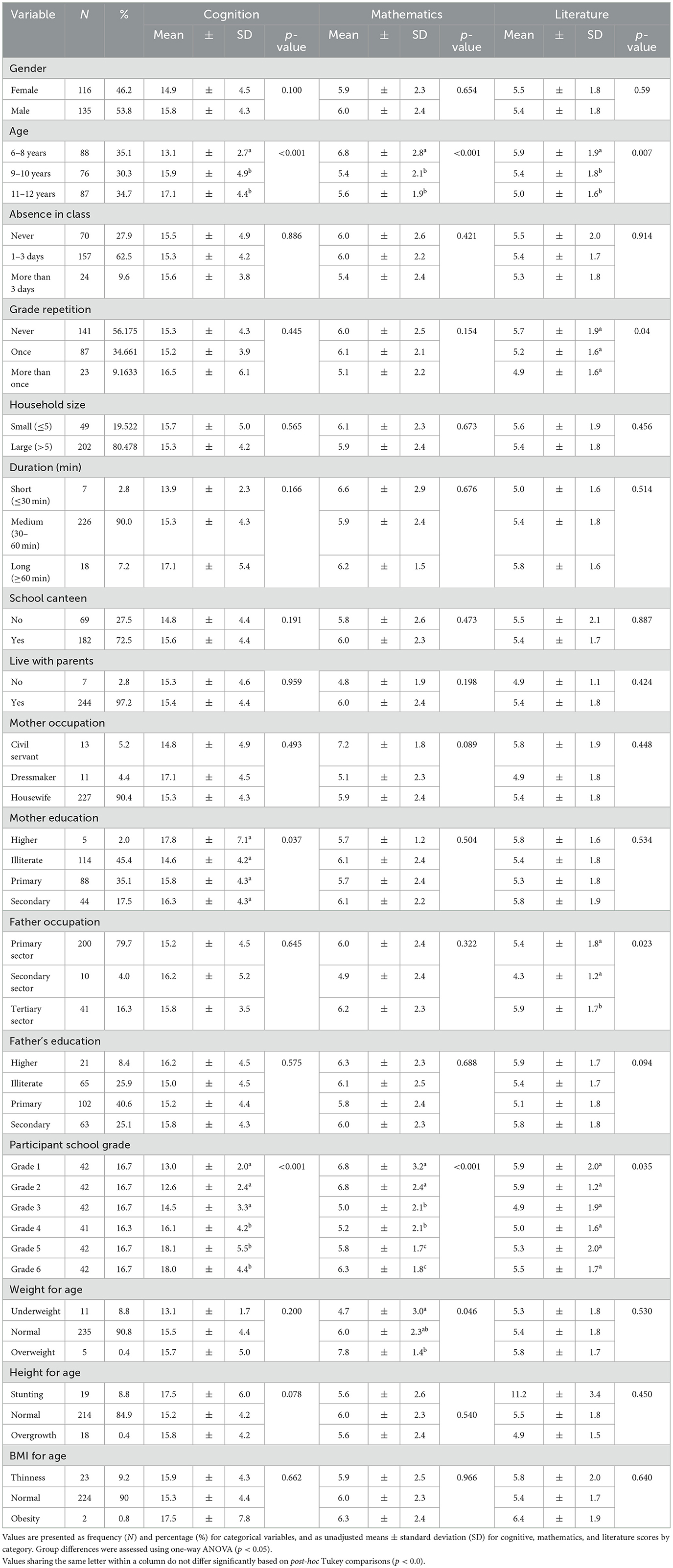 School performance was quantified based on end-of-year results in mathematics and literature. Performance score was classified as low if it was less than 50th, medium if it was 50th−75th, and high if it was ≥75th (41). The corresponding threshold scores were mathematics (low < 6, medium 6–7.6, and high ≥ 7.6) and literature (low < 5, medium 5–6.43, and high ≥6.43). The end-of-year mathematics and literature results were based on regional harmonized examinations administered across all schools under the supervision of the District Education Office of Taabo. In Côte d'Ivoire, primary schools are organized under regional district education offices of the Ministry of Education. Teachers use marking schemes issued by the regional district office in accordance with national curriculum guidelines, which helps minimize potential teacher-related bias in grading. Although evaluation procedures are not standardized at the national level, their standardization at the regional level ensures consistent assessment of children's performance across schools in this study.