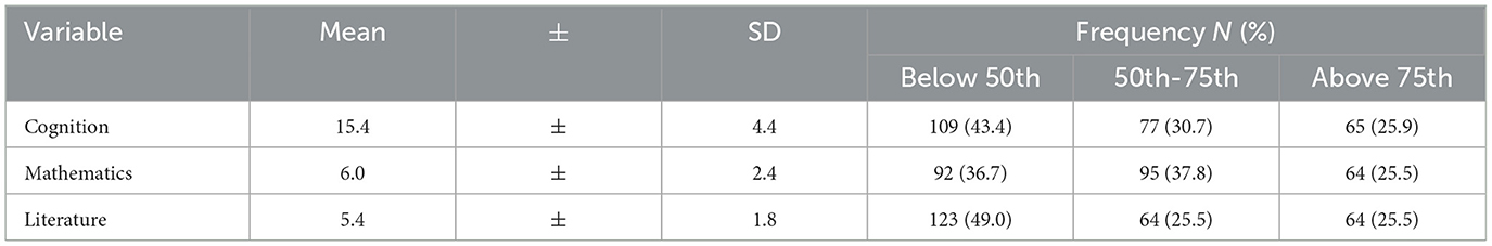 Table 2. Mean scores and standard deviation (SD) in cognitive tests, mathematics, and literature and distribution of scores across performance categories: low performance (below the 50th percentile), average performance (50th-75th percentile), and high performance (above the 75th percentile).
