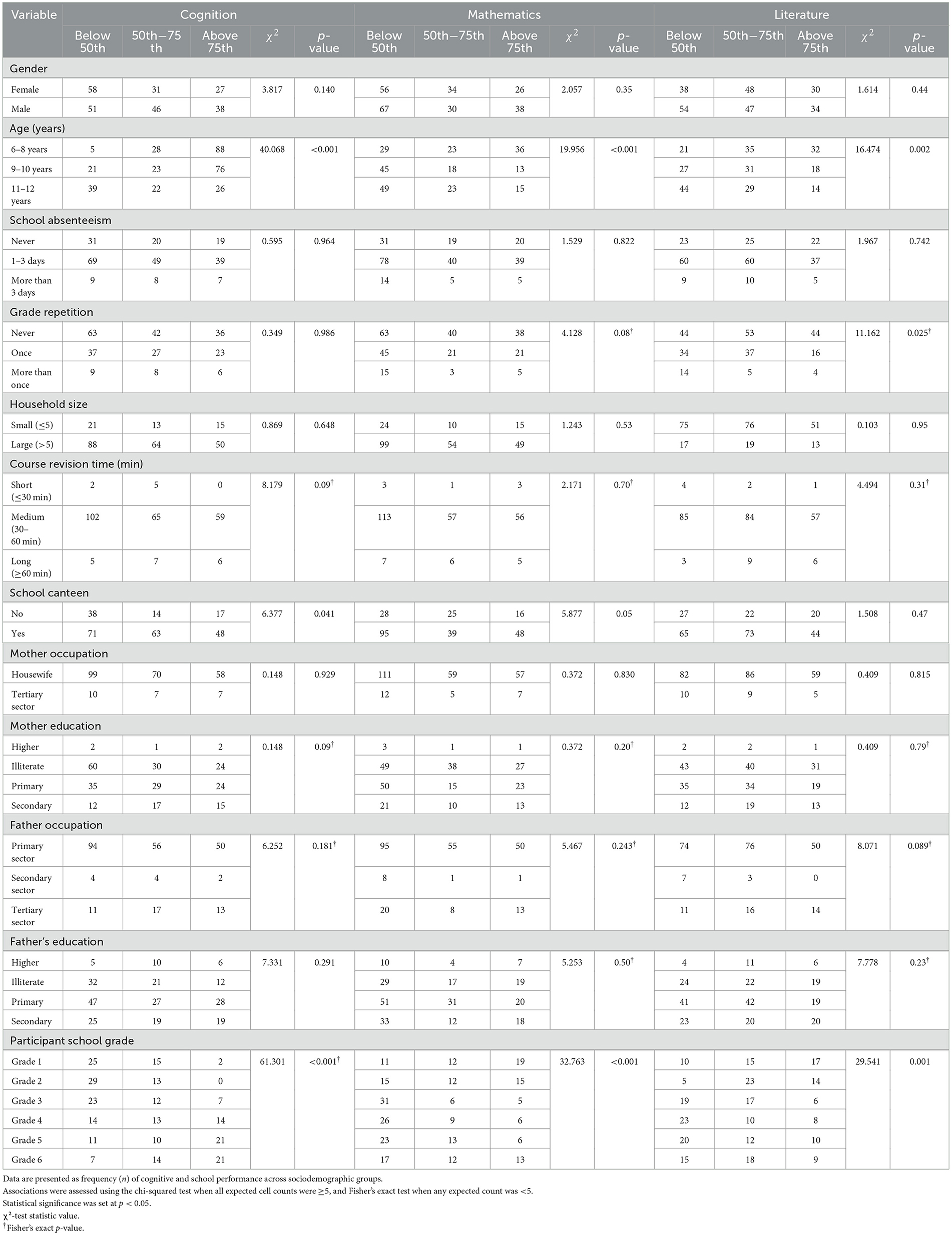 Comparing mean scores across sociodemographic groups using ANOVA, significant differences were observed between age groups and school grade levels in cognitive and school performance. Older children aged 11–12 years (17.1 ± 4.4) outperformed younger children aged 6–8 years (13.1 ± 2.7) in the cognitive test. In contrast, older children (11–12 years) had lower performance in mathematics and literature compared to younger children. Regarding grade levels, children in higher grades (five and six) demonstrated better cognitive performance than those in lower grades. For school performance, both lower and higher grades showed higher scores, whereas middle grades (three and four) had significantly lower performance (p < 0.05). No significant differences were observed in the literature across grade levels. Additional significant associations (p < 0.05) were found for maternal education (cognition) and for grade repetition and paternal occupation in the literature; however, post-hoc Tukey tests revealed no consistent pairwise differences across these sociodemographic groups. Furthermore, it can be seen from the data in Table 3 that school cafeteria attendance (χ2 = 6.4, p = 0.041) and school grade (χ2 = 61.3, p < 0.001) were significantly associated with cognitive performance. Mathematics performance was associated with age group (χ2 = 19.9, p < 0.001) and school grade (χ2 = 32.8, p < 0.001), while literature performance was associated with age group, school grade level (χ2 = 29.5, p < 0.001), and grade repetition (χ2 = 11.2, p = 0.025).