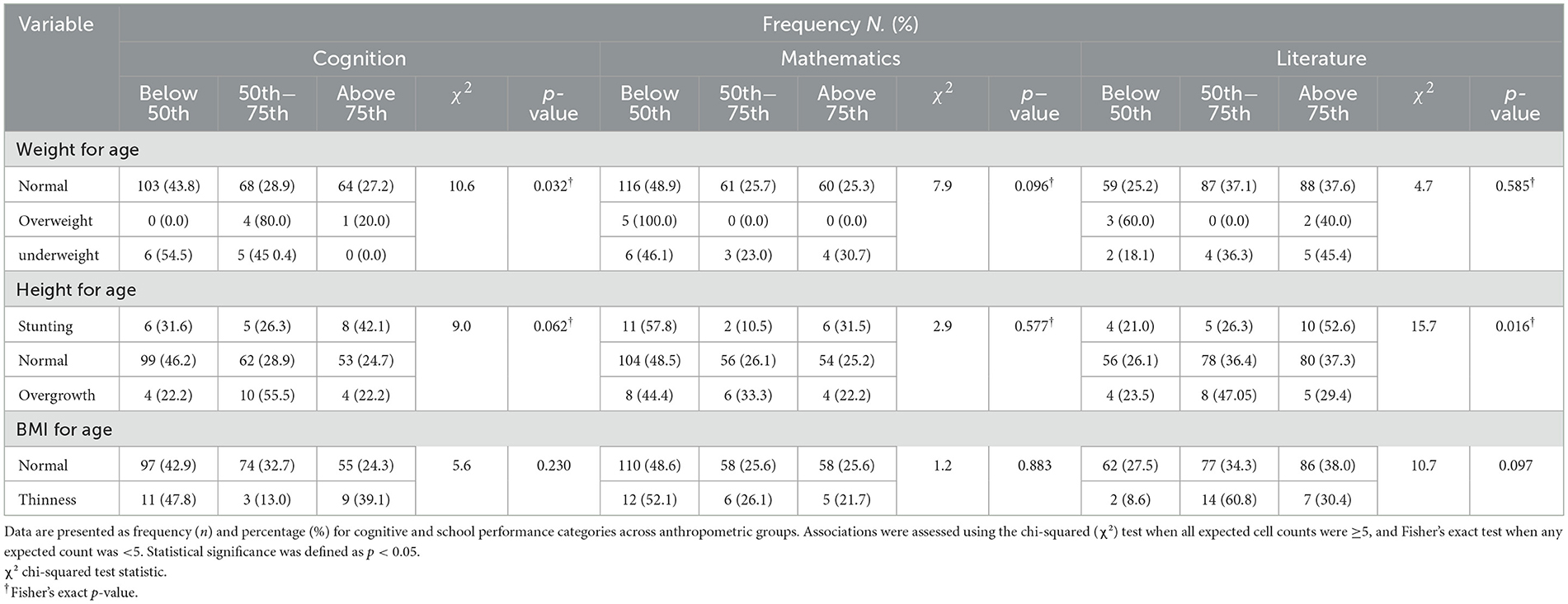 Table 4. Cognitive and academic performance by anthropometric status with performance category: high (above the 75th percentile), average (50th−75th percentile), and low (below the 50th percentile).