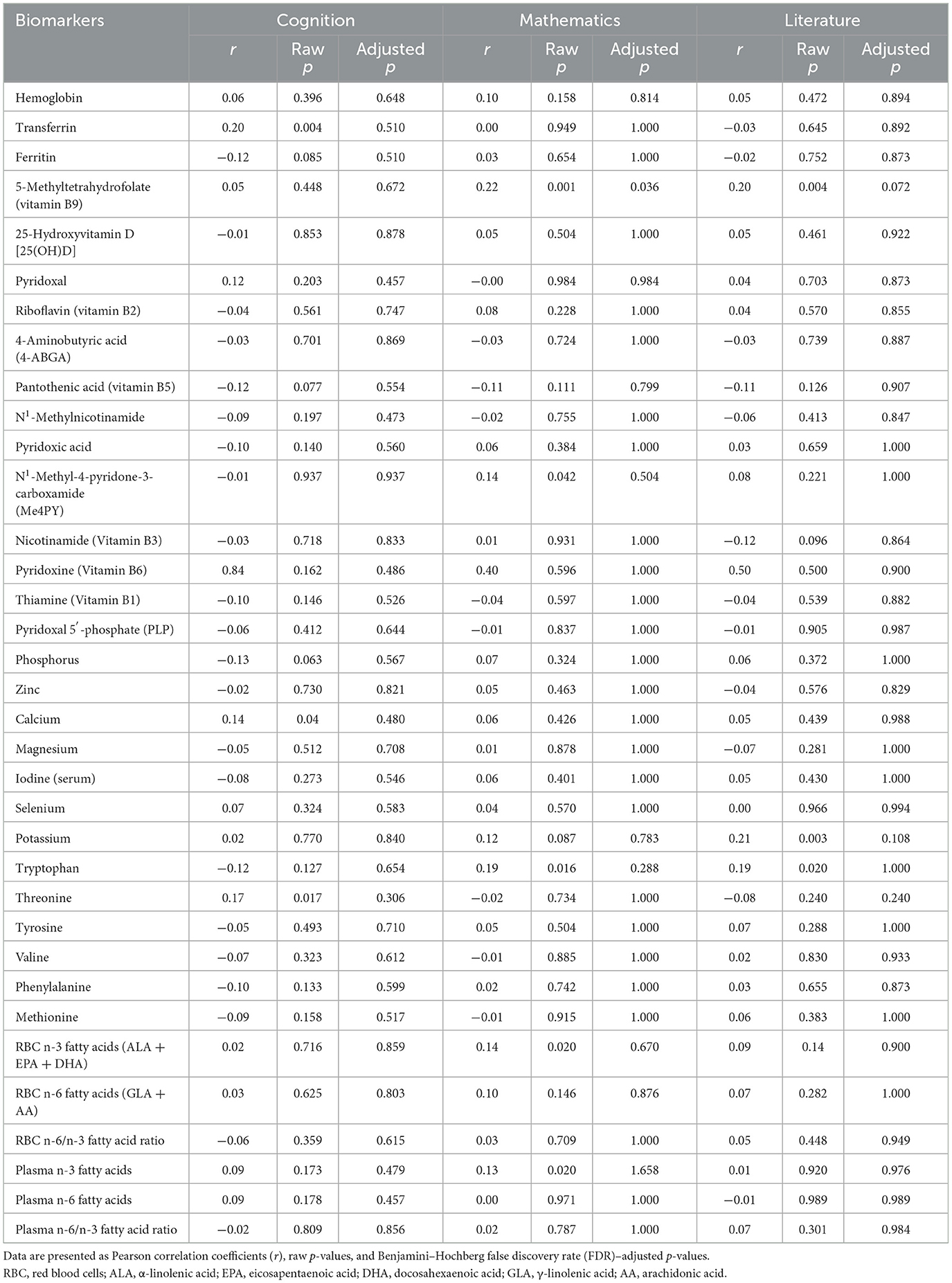 The results of the correlational analysis are provided in Table 5. Significant correlations were found between certain biomarkers and cognitive or academic outcomes. For cognition, positive correlations were observed with transferrin (r = 0.20, p = 0.008), tryptophan (r = 0.165, p = 0.017), and calcium (r = 0.14, p = 0.04). For mathematics performance, significant associations were observed with active folate (5-methyltetrahydrofolate; r = 0.22, p = 0.006), potassium (r = 0.193, p = 0.016), RBC omega-3 fatty acids (r = 0.14, p = 0.02), and plasma omega-3 fatty acids (r = 0.14, p = 0.02). For literature, positive correlations were found with active folate (r = 0.20, p = 0.009) and potassium (r = 0.187, p = 0.020). No significant associations were observed for hemoglobin, ferritin, vitamin D, riboflavin, zinc, iodine, omega-6 fatty acids, or fatty acid ratios with cognitive and school performance.