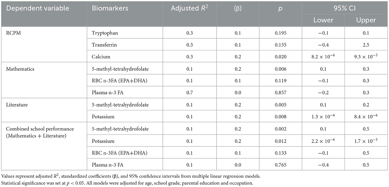 The multivariable linear regression models, adjusted for age, school grade, parental education, and occupation, identified several blood nutrient biomarkers that significantly explained variations in cognitive and academic performance (Table 6). For cognitive performance assessed using RCPM, calcium was the only significant predictor (R2 = 0.3, p = 0.020), with the 95% CI ranging from 8.2 × 10−6 to 9.3 × 105, while tryptophan and transferrin were not significant. In mathematics performance, 5-methyl-tetrahydrofolate emerged as a strong predictor (R2 = 0.1, p = 0.006; 95% CI: 0.1–0.3), whereas RBC n-3 fatty acids and plasma n-3 fatty acids showed non-significant associations. Similarly, for literature scores, both 5-methyl-tetrahydrofolate (R2 = 0.08, p = 0.005; 95% CI: 0.1–0.2) and potassium (R2 = 0.1, p = 0.008; 95% CI: 1.3 × 10−6−8.4 × 10−6) were significant predictors. When combining mathematics and literature into overall school performance, both 5-methyl-tetrahydrofolate (R2 = 0.1, p = 0.002; 95% CI: 0.1–0.5) and potassium (R2 = 0.1, p = 0.012; 95% CI: 2.2 × 10−6−1.7 × 105) remained significant, whereas RBC n-3 FA and plasma n-3 FA were not.