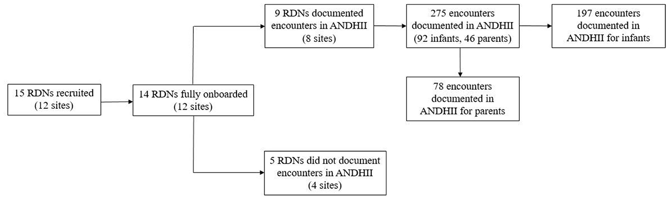 RDNs were required to: (1) hold state licensure to provide MNT, where applicable, (2) provide nutrition care to breastfeeding infants in their typical work environment, and (3) adhere to training and study protocols. Exclusion criteria included: (1) lack of RDN credentialing from the Commission on Dietetic Registration; (2) lack of required state licensure (where applicable); or (3) unwillingness/inability to document care in ANDHII.
