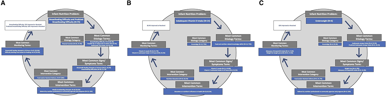 Figure 2. Impactful Care Plans for the nutrition diagnoses with the highest rate of resolution in the Breastfeeding Registry Study: Breastfeeding Difficulty/Predicted Breastfeeding Difficulty (A); Underweight (B); Inadequate Vitamin D Intake (C).