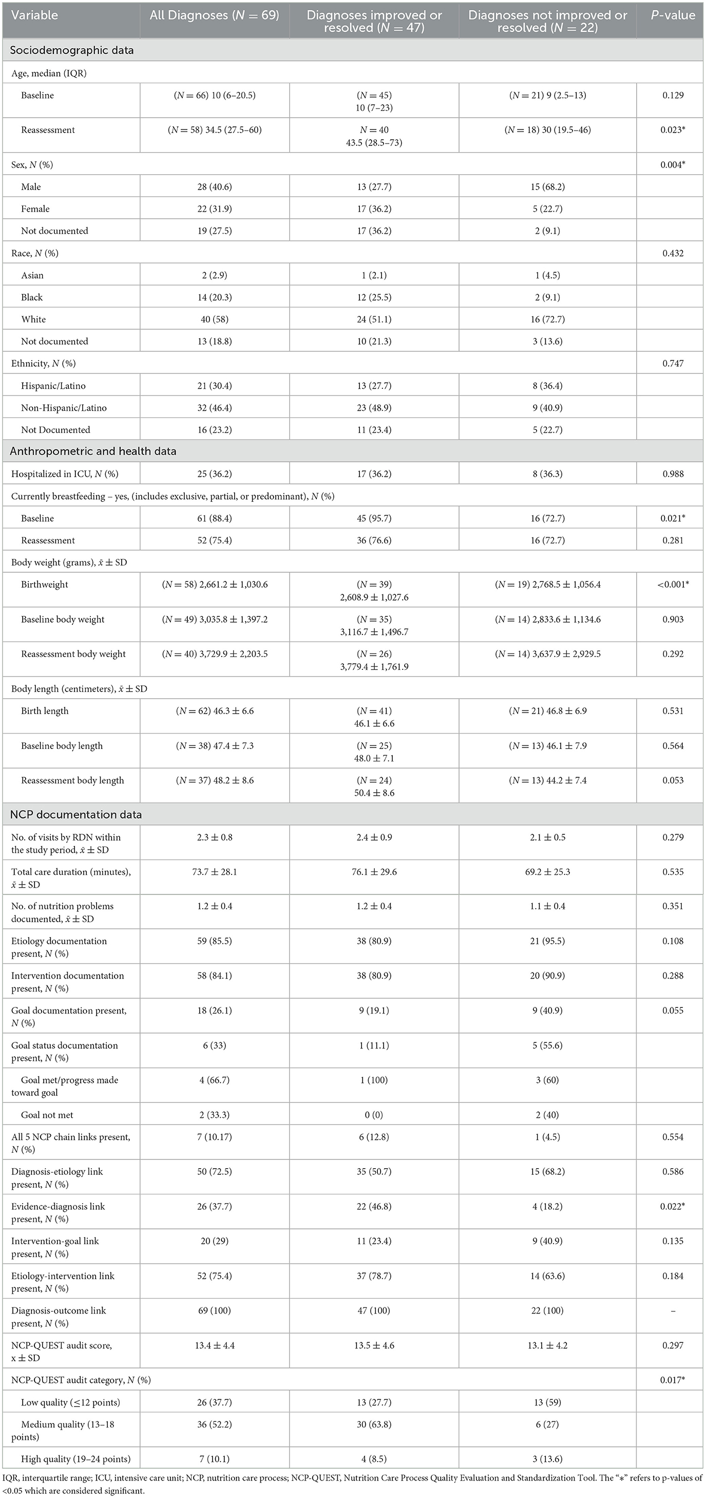 Results: Duration of any breastfeeding averaged 34.2 ± 7.5 (mean ± SD) days (n = 10), although documentation of this indicator was poor. The most frequent etiology was breastfeeding difficulty (18%). Common intervention categories were Food and/or Nutrient Delivery (46%) and Coordination of Nutrition Care (43%). At reassessment, 68% of diagnoses improved, with the highest rates for breastfeeding difficulty (55%), predicted breastfeeding difficulty (83%), inadequate vitamin D intake (83%), and underweight (83%). NCP-QUEST score (OR = 1.58, 95% CI [1.02, 2.45] p = 0.042) and frequency of registered dietitian visits (OR = 1.77, 95% CI [0.34, 0.9.33] p = 0.049) predicted diagnosis improvement.
