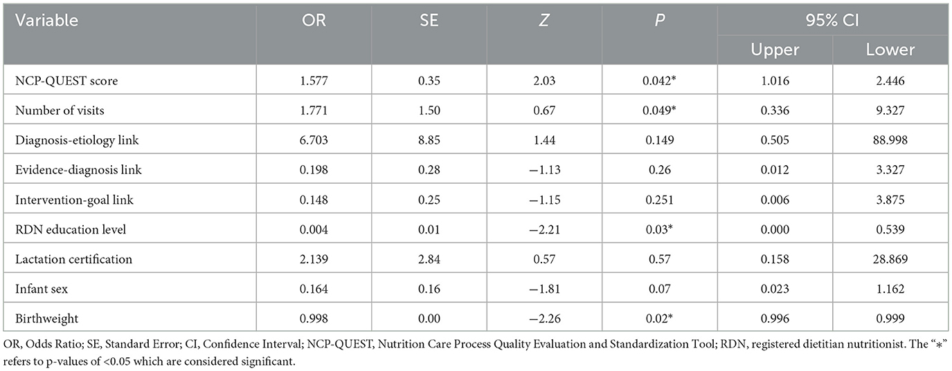 Similar to prior research (19, 20), higher quality NCP documentation predicted better outcomes: each one-point increase in NCP-QUEST score was associated with a 58% greater likelihood of diagnosis improvement and resolution (OR = 1.58, 95% CI [1.01, 2.45], p = 0.042) (Table 2) (19, 20). Consistent with findings by Lewis et al. (20) each additional nutrition visit was associated with a 77% greater likelihood of diagnosis improvement (OR = 1.77, 95% CI [0.34, 9.33], p = 0.049), suggesting that more frequent contact with RDNs improved health-related outcomes for infants in the BFR (Table 2). Notably wide confidence intervals among predictors are likely due to the small sample size of this pilot registry study and may limit interpretation of the statistical model.