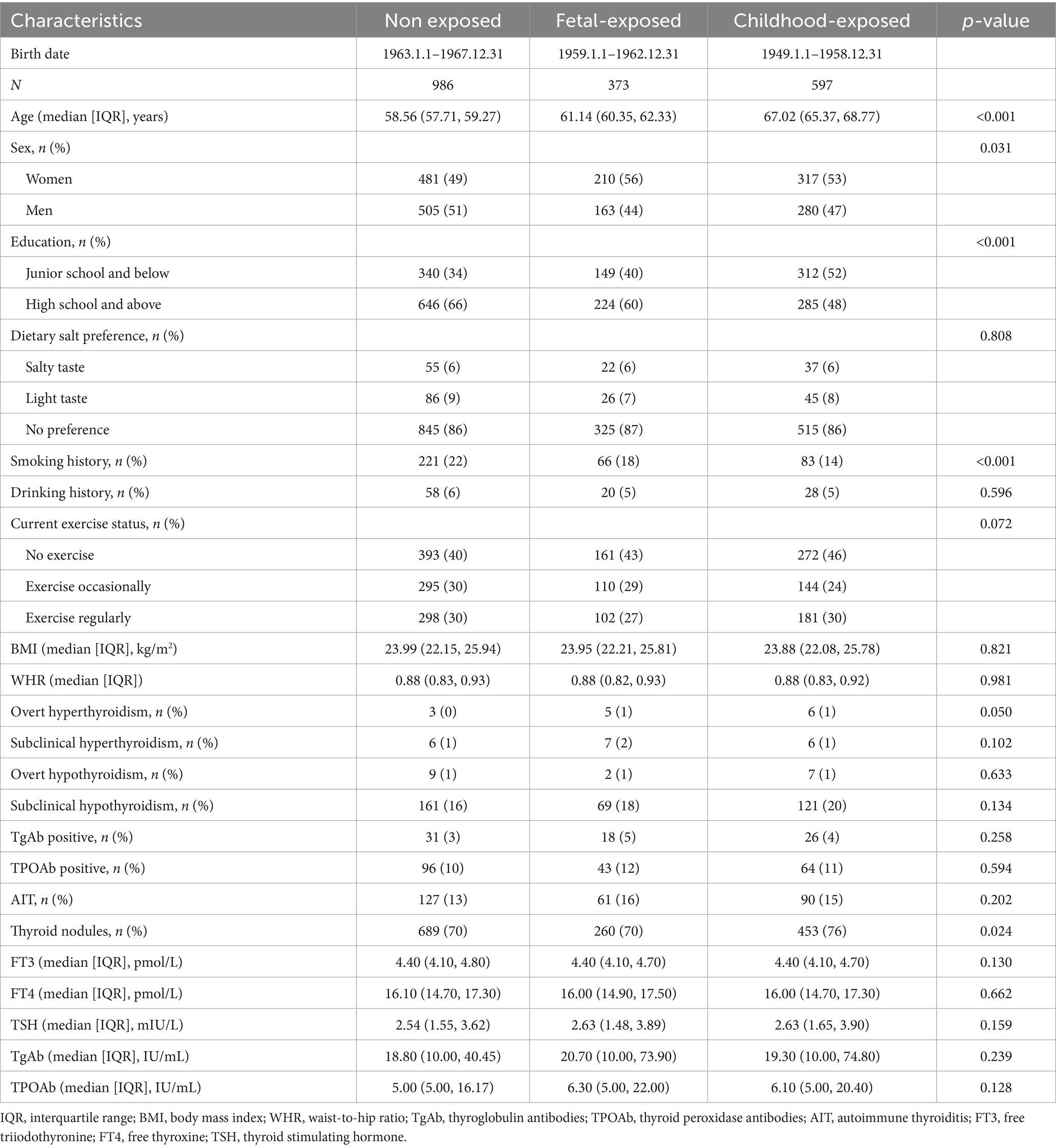 Results: In this study, 373 participants (19.1%) were exposed to the Chinese Great Famine during the fetal period, with 597 individuals (30.5%) experiencing childhood exposure. After adjusting for gender, smoking history, drinking history, dietary salt preference, current exercise status, educational level, body mass index (BMI), the fetal-exposed group demonstrated significantly elevated risks of both overt hyperthyroidism [OR = 4.36, 95% CI (1.02–18.71)] and subclinical hyperthyroidism [OR = 3.13, 95% CI (1.03–9.51)] compared to the non-exposed group. After adjusting for multiple comparisons using the Benjamini-Hochberg FDR method, fetal famine exposure maintained a statistically significant inverse association with thyroid nodule risk relative to childhood exposure [OR = 0.69, 95% CI (0.51–0.93)]. No significant associations were observed between famine exposure and hypothyroidism, thyroid autoantibody positivity, or autoimmune thyroid disorders. Notably, childhood-exposed participants exhibited higher thyroglobulin antibody (TgAb) levels versus non-exposed individuals [β = 40.30, 95% CI (2.21–78.40)].
