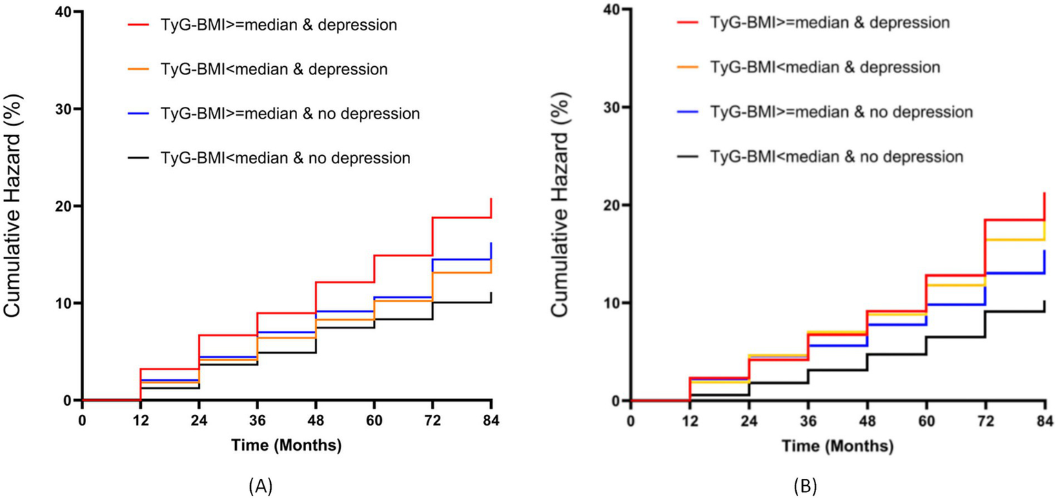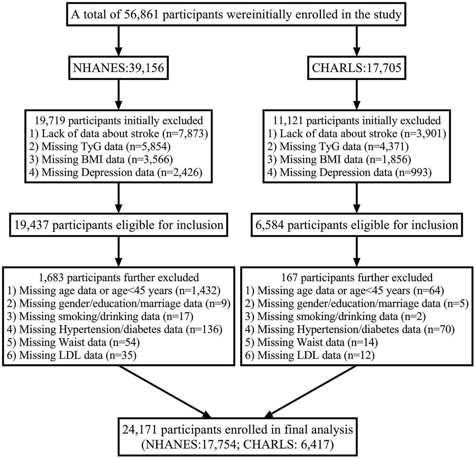 Thus, we designed this study based on two large national cohorts to explore the combined relationship between TyG-BMI, depression, and stroke risk. We hope that this study will contribute to a deeper understanding of stroke risk factors and guide future public health interventions aimed at reducing stroke incidence.