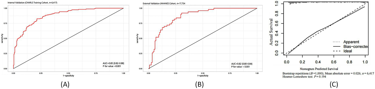 Depressive symptoms in CHARLS were assessed using the 10-item Center for Epidemiologic Studies Depression Scale (CESD-10). The scale consists of 10 questions, with a total score range from 0 to 30. A score of ≥12 is defined as “positive for depressive symptoms,” indicating clinically significant depression. In the NHANES database, the Patient Health Questionnaire-9 (PHQ-9) was used to assess depression. A score below 10 indicates no depression, while a score of 10 or higher indicates depression. The PHQ-9 is considered the most reliable screening tool for depression (27), with a sensitivity and specificity of 88% for detecting major depression at a cutoff of 10 (28).