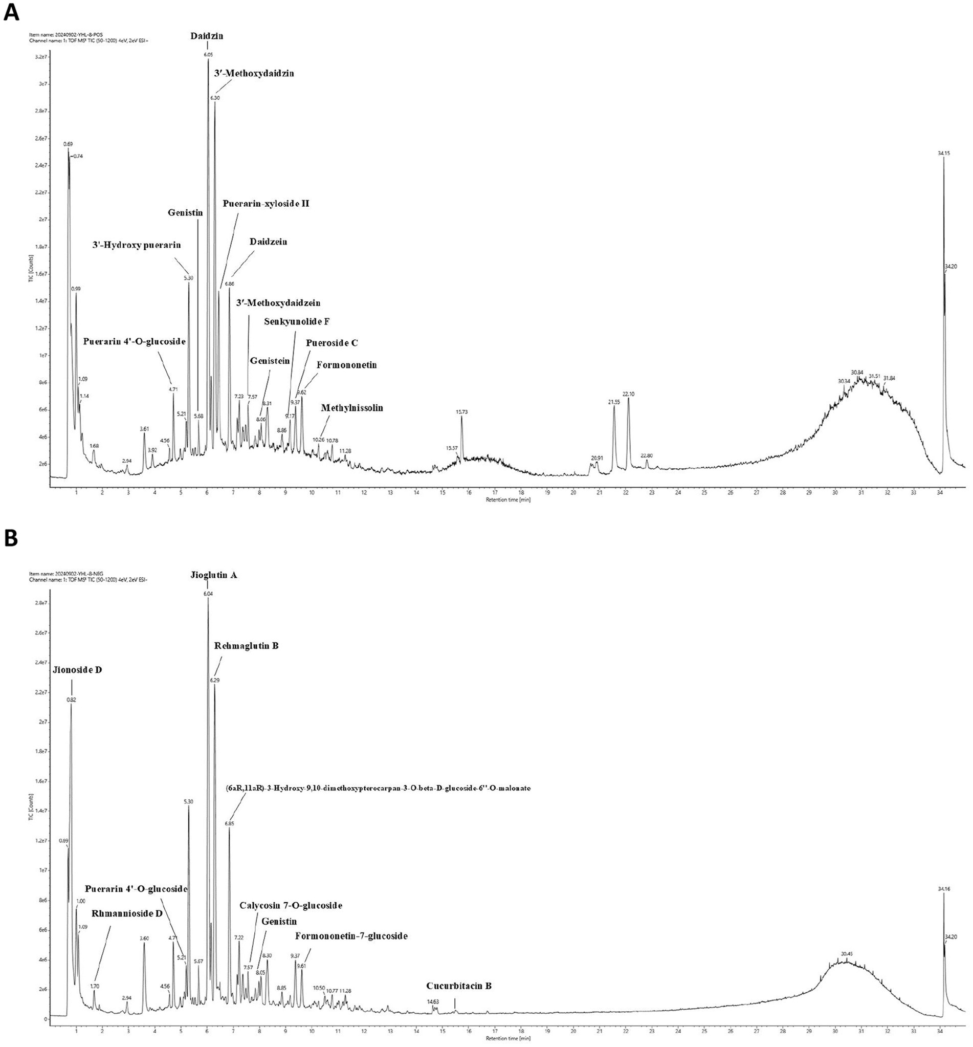 Two chromatograms labeled A and B show diversified chemical compounds identified over different retention times. Peaks are clearly marked with compound names, such as Daidzin and Genistin in A, and Jioagitin A and Rhaonagitin B in B. These chromatograms illustrate the separation and identification of compounds using high-performance liquid chromatography.