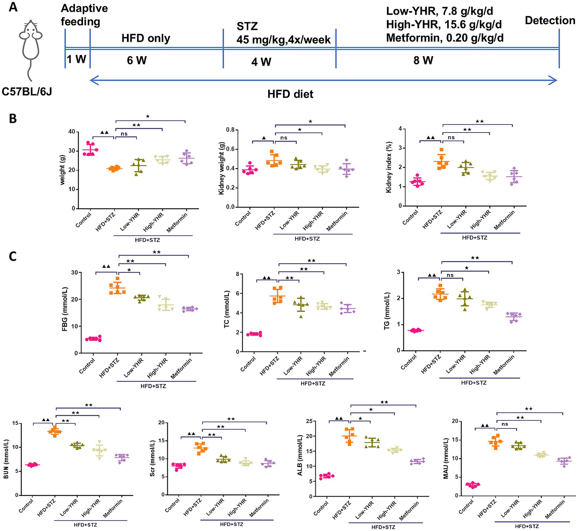 Figure 2. Detection of biochemical indexes of DN mice. C57BL/6 J mice were fed with high-fat diet and injected with streptozotocin to induce DN; then YHR at different dosages as well as positive control metformin were intragastric gavaged for 8 weeks. (A) Schematic of the study design; (B) body weight, kidney weight, and kidney organ index (%) of the mice were recorded and calculated. (C) FBG, TC, TG, BUN, Scr, ALB, and MAU levels were detected. DN, diabetic nephropathy; STZ, streptozotocin; HFD, high-fat diet; YHR, Yiqi Huoxue recipe; FBG, fasting blood glucose; ALB, urinary albuminuria; MAU, microscale albuminuria. Data were expressed as mean ± standard deviation, n = 6. Compared to the control group, p < 0.05, ▲▲ p < 0.01; compared to the HFD + STZ group, * p < 0.05, ** p < 0.01.