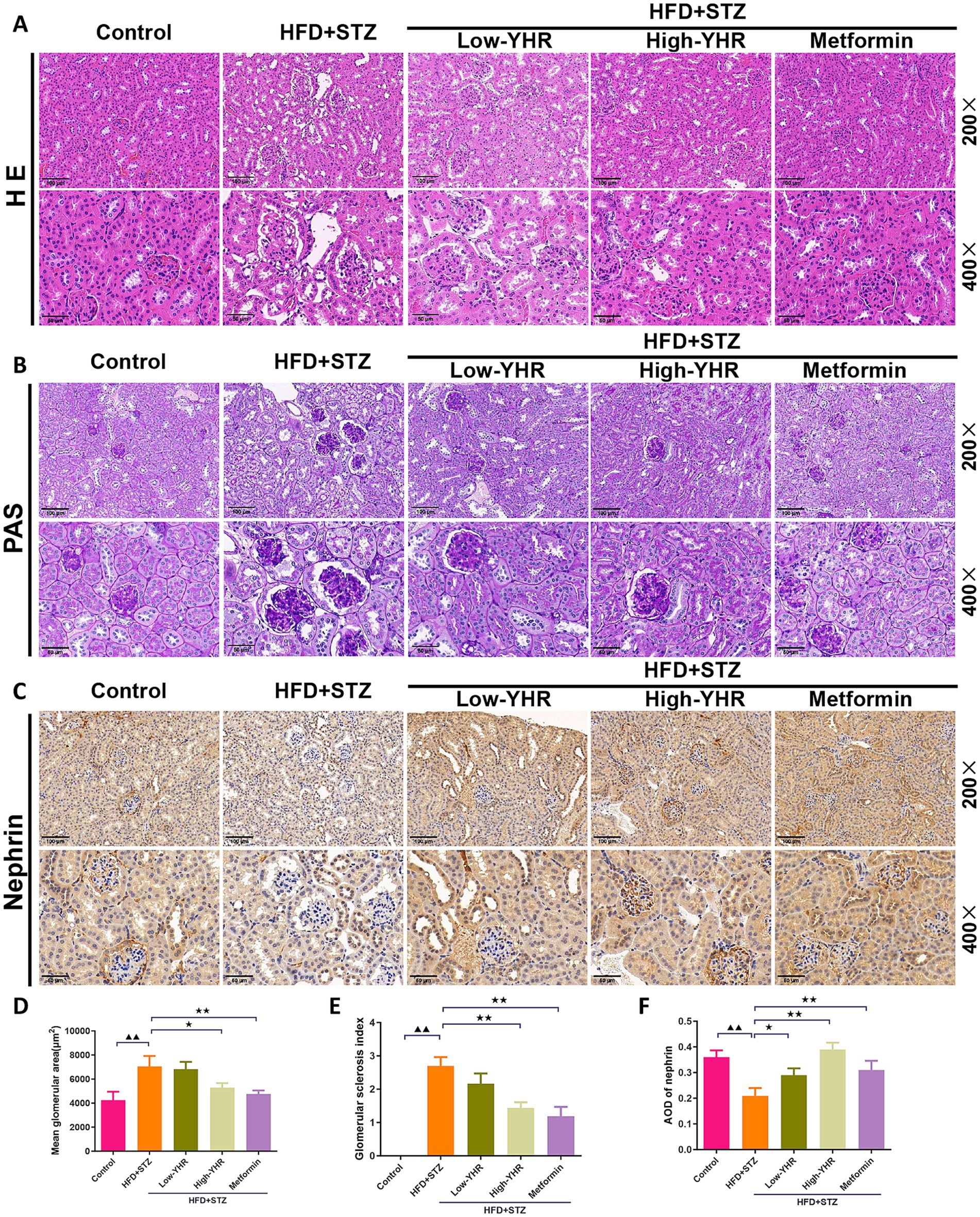 Figure 3. Evaluation of kidney pathologic impairment in DN mice. (A) H&E staining of the kidney tissues, (B) PAS staining of the kidney tissues, (C) immunohistochemistry staining of nephrin, a biomarker of podocytes. 200×, scale bar = 100 μm, 400, scale bar = 50 μm. (D) Mean area of glomerulus was also calculated based on H&E staining. (E) glomerulosclerotic index was calculated based on PAS staining. (F) The relative density of nephrin was quantified by calculating AOD value. DN, diabetic nephropathy; STZ, streptozotocin; HFD, high-fat diet; YHR, Yiqi Huoxue recipe; AOD, average optical density. n = 3. Compared to the control group, p < 0.05, ▲▲ p < 0.01; compared to the HFD + STZ group,* p < 0.05, ** p < 0.01.