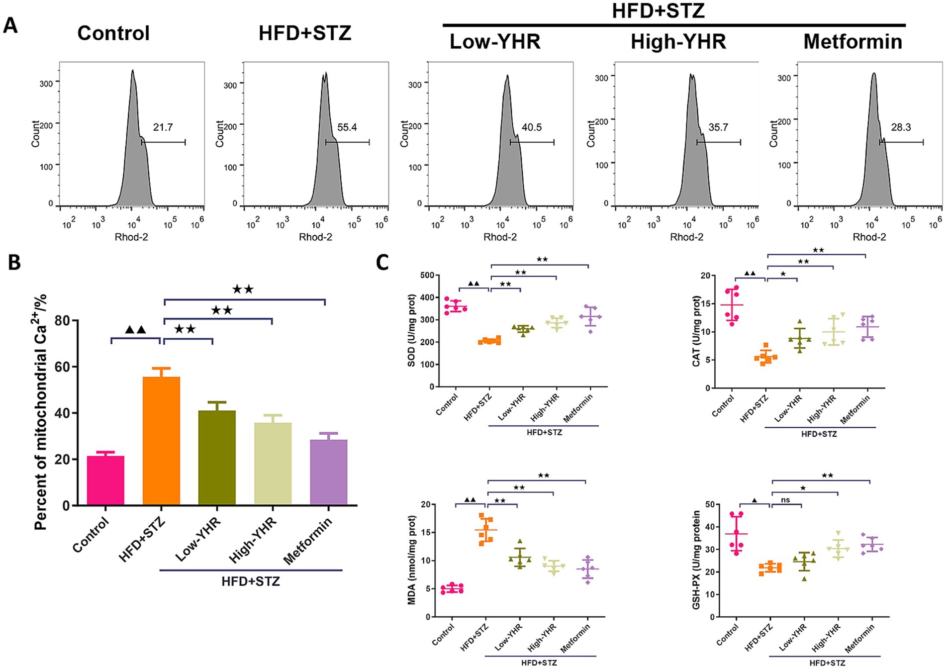 Flow cytometry data and bar charts compare various treatments: Control, HFD+STZ, Low-YHR, High-YHR, and Metformin. **A**: Histograms show mitochondrial calcium levels, highest in HFD+STZ.**B**: Bar graph depicts mitochondrial Ca\(^2+\) percentages, with statistical significance indicated by symbols, highest in HFD+STZ.**C**: Scatter plots display levels of SOD, CAT, MDA, and GSH-PX enzymes, highlighting significant differences between groups.