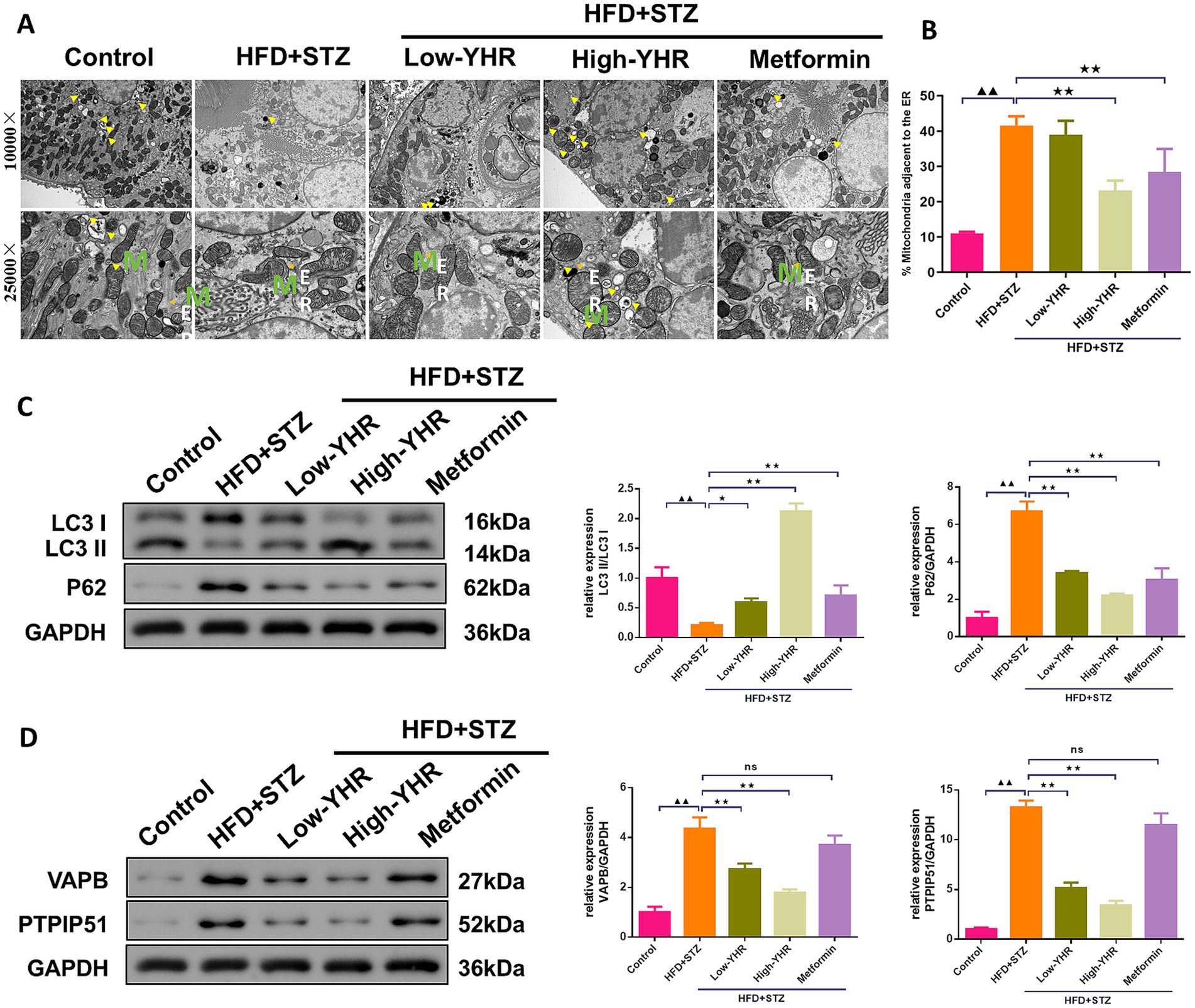Figure panel with microscopic images and bar graphs examining cellular changes under various conditions labeled as Control, HFD+STZ, Low-YHR, High-YHR, and Metformin. Panel A shows electron micrographs with differences in mitochondria and endoplasmic reticulum proximity. Panel B presents bar graphs illustrating the percentage of mitochondria adjacent to the endoplasmic reticulum. Panels C and D contain Western blot analyses and graphs for protein expressions, including LC3, P62, VAPB, and PTIP51, normalized to GAPDH, with statistical significance indicated.