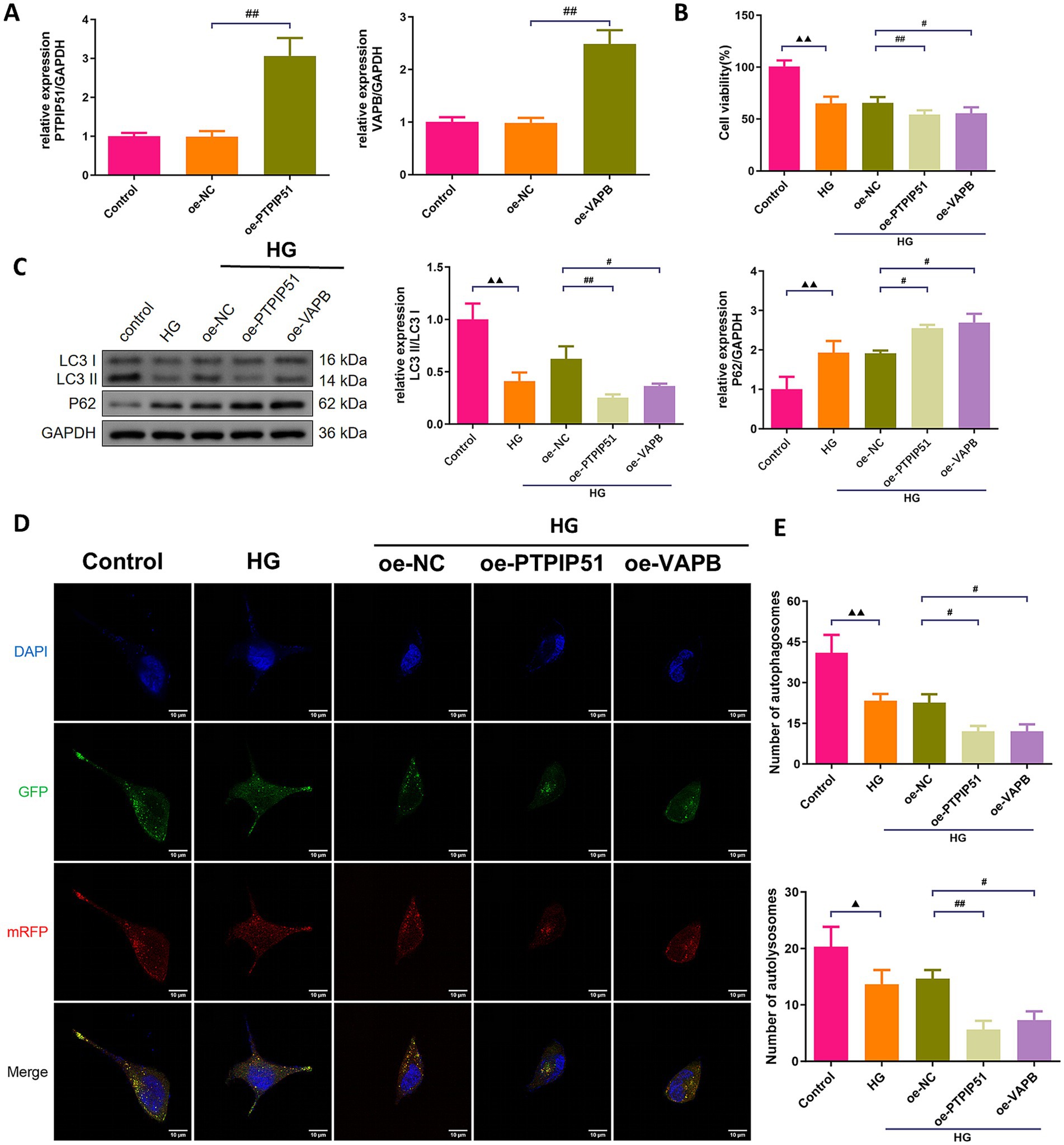 Figure 6. Overexpression of VAPB-PTPIP51 suppressed podocyte autophagy. MCP-5 cells were transfected with oe-PTPIP51, oe-VAPB or negative control (oe-NC), and stimulated with HG (50 mmol/L glucose). (A) The mRNA expressions of PTPIP51 and VAPB were detected by qRT-PCR. n = 3. (B) The cell activity was detected by CCK-8 assay. n = 6. (C) The protein expression of autophagy indicators, LC3 II/I and p62, were detected by Western blot. (D) Changes in autophagosomes and autophagic lysosomes in MPC-5 cells. n = 3. (E) Changes in the number of autophagosomes and autophagic lysosomes in MPC-5 cells by subgroups. n = 3. HG: high glucose. Compared to the control group, p < 0.05, ▲▲ p < 0.01; compared to HG group, * p < 0.05, ** p < 0.01; compared to the oe-NC group, # p < 0.05, ## p < 0.01.