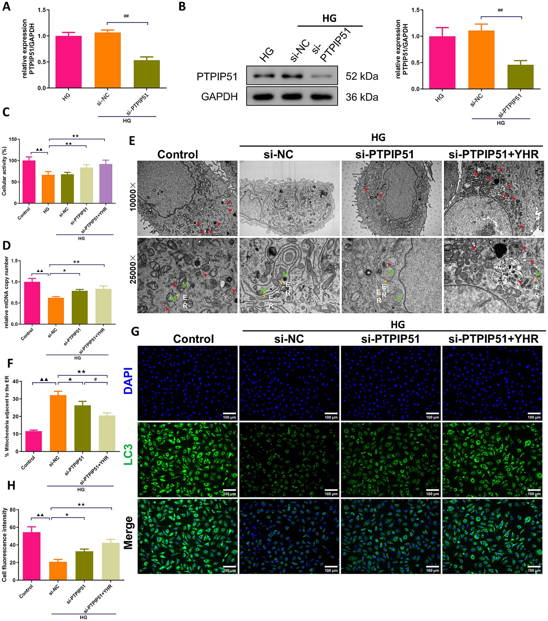 Figure 7. YHR activated the autophagy of podocyte via inhibiting VAPB–PTPIP51. Podocytes, MCP-5 cells, were transfected with si-PTPIP51 or negative control (si-NC) and stimulated with HG (50 mmol/L glucose), then 10% YHR-containing serum was added. (A) The mRNA expression of PTPIP51 was detected by qRT-PCR. n = 3. (B) The protein expression of PTPIP51 was detected by Western blot. n = 3. (C) The cell activity was detected by CCK-8 assay. n = 6. (D) mtDNA copy number was detected. n = 3. (E) TEM was used for MAM and autophagy detection, red arrow indicates autophagosome, M indicates mitochondria, ER indicates endoplasmic reticulum. (F) The proportion of mitochondria adjacent to the ER in MCP-5 cells. n = 3. (G,H) The expression of LC3, autophagy indicator, was detected by immunofluorescence staining. 200×, scale bar = 100 μm, 400, scale bar = 50 μm. n = 3. HG, high glucose; YHR, Yiqi Huoxue recipe. Data were expressed as mean ± standard deviation, n = 3. Compared to the control group, p < 0.05, ▲▲ p < 0.01; compared to the si-NC group, * p < 0.05, ** p < 0.01; compared to the HG group, * p < 0.05, ** p < 0.01; compared to the si-PTPIP51 group, # p < 0.05, ## p < 0.01.