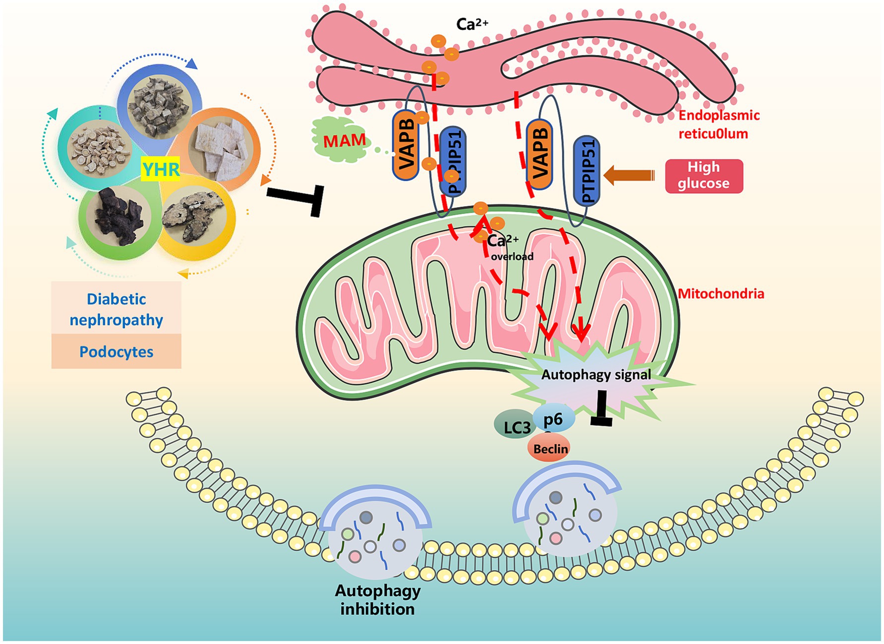 In summary, we established HG cell and DN mouse models to identify overexpression of VAPB–PTPIP51, alterations in MAM structure, mitochondrial calcium overload, and inhibition of autophagy, alongside kidney and podocyte damages. YHR’s therapeutic impact in DN appears to involve enhancing autophagy, modulating mitochondrial calcium levels through the MAM complex VAPB–PTPIP51. This research aims to elucidate the mechanisms of YHR in treating DN, offering a theoretical foundation for the clinical application of TCM and the development of new drugs for DN therapy.