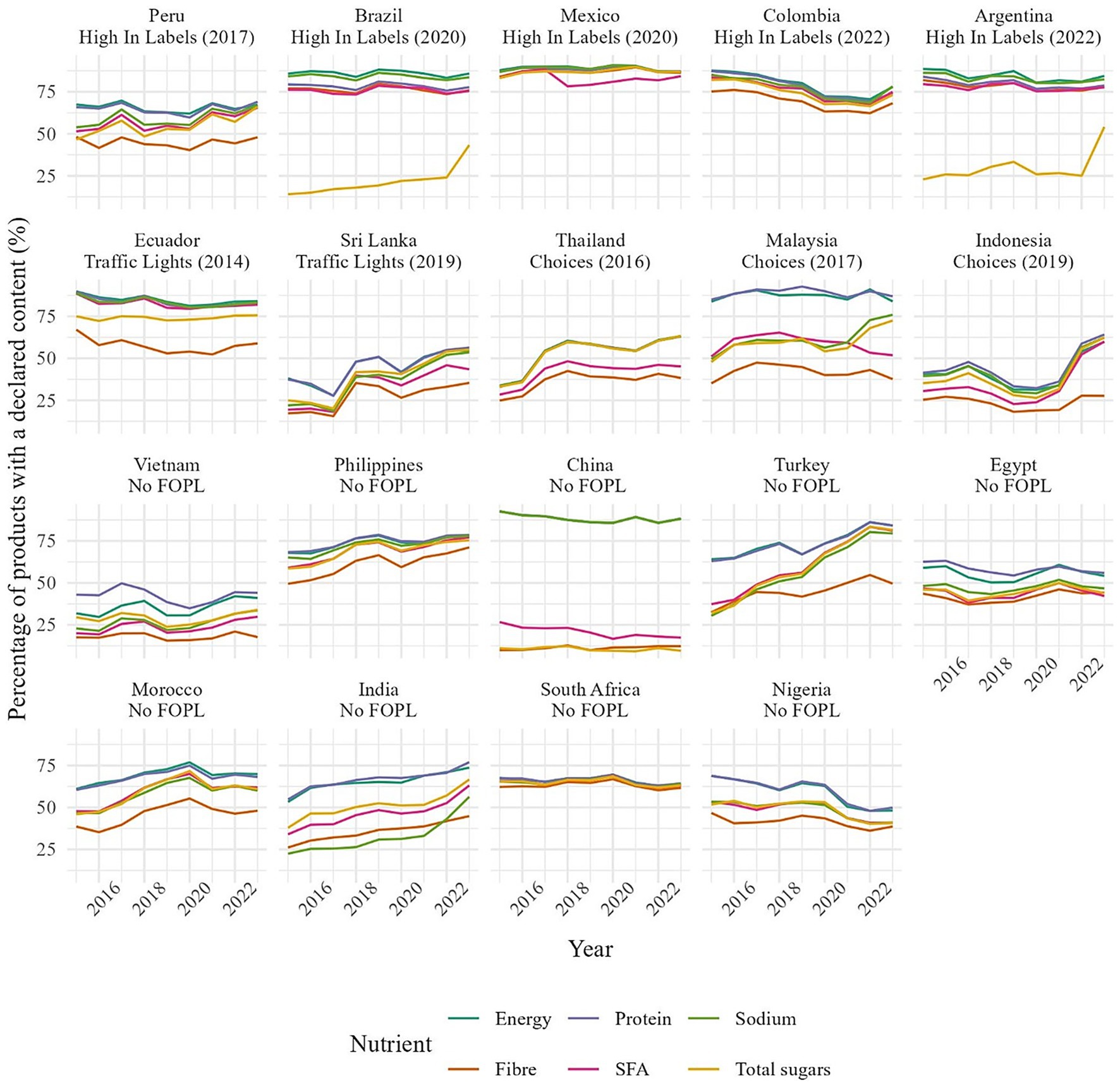 In addition, change in nutrient content was assessed by difference-in-difference analysis in countries where a FOPL has been implemented. The percentage of products with an “improved” nutrient content in 2018–2020 and 2021–2023 was compared to the 2015–2017 median value for each category within each country to identify improvements in nutrient content independently of the baseline value and by type of FOPL. Percentages were then aggregated at a country level with a 95% confidence interval. “Improved” was defined as lower content than the 2015–2017 median for energy, total sugars, SFA and sodium and higher content than the 2015–2017 median for protein and fiber. Chinese products as well as total sugars in Brazilian and Argentinian products were excluded from the analysis due to inconsistent declaration rates over the years (Figure 1). Only categories with a non-null median were considered.