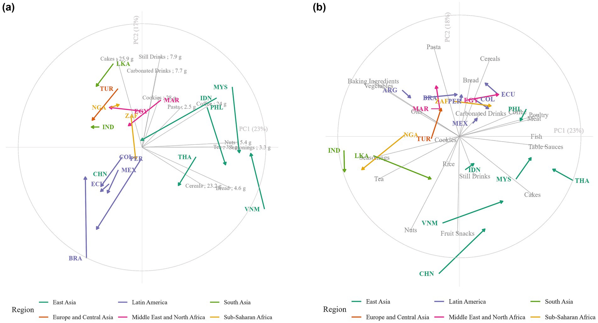 LMICs were mapped according to the top 20 product categories in their food supply using PCA (Figure 2a). Changes in the newly launched food supply from the period 2015–2017 to 2021–2023 are represented with arrows. Food supply from countries in the same region are grouped together and most arrows are short except for Sri Lanka, Nigeria Vietnam and China suggesting that the composition of the food supply remains regionalized over time. Additionally, East Asian newly launched packaged foods belonged mostly to animal-based categories (Poultry, Meat, Fish), as well as Table Sauces, and Snacks. In India, Sri Lanka, and in Nigeria, most launches happened in staples and ingredients (Seasonings, Tea, Baking Ingredients, Vegetables). Latin American and Mediterranean countries relied mostly on wheat-based products such as Pasta, Bread, and Cereals.