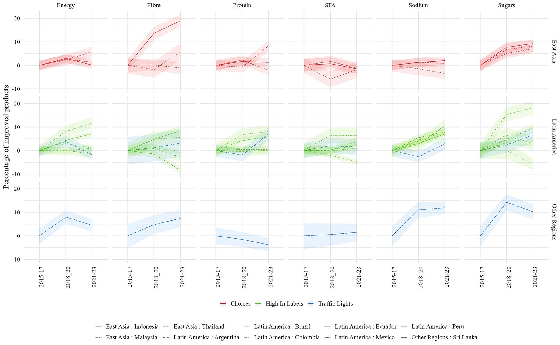 Figure 3. Difference in the percentage of products having an improved median content in energy, fiber, saturated fatty acids, protein, sodium and total sugars compared with 2015–2016-2017 by country and region. Only countries with a FOPL implemented are presented. Ribbon represents confidence interval at 95%. Only categories with a non-null median are considered in this analysis.