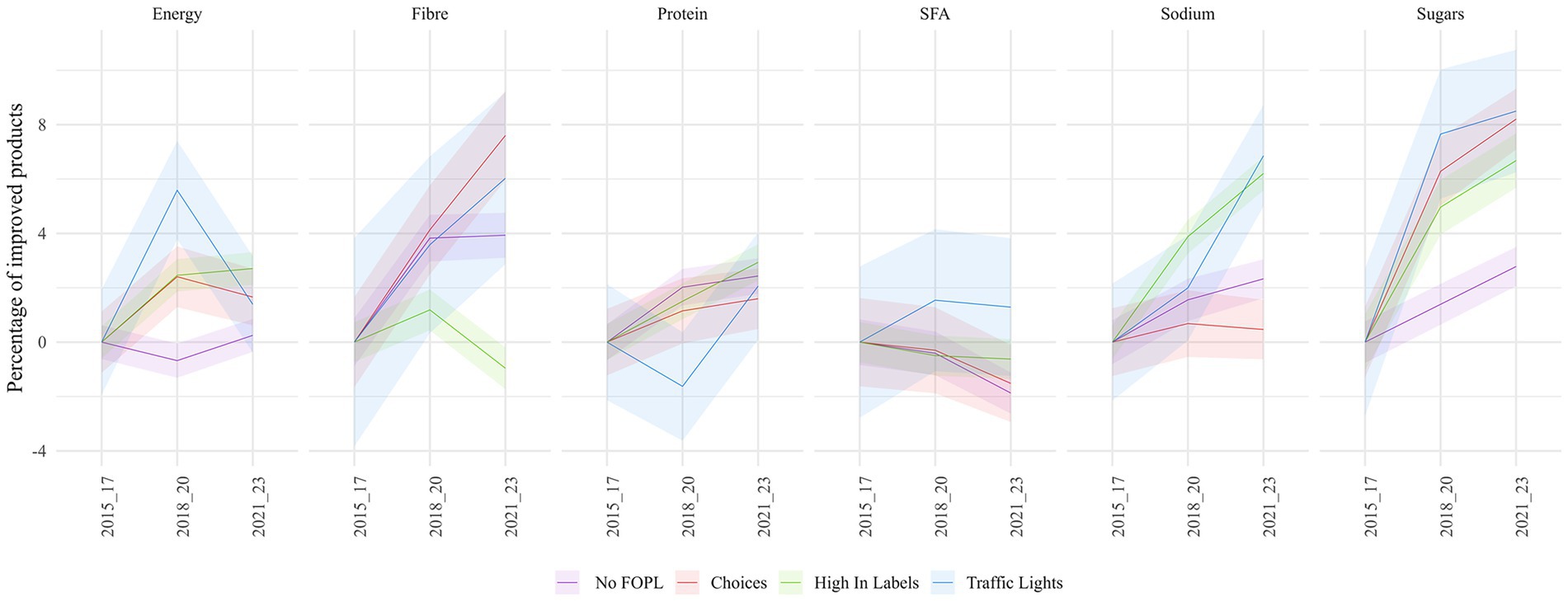 Changes in nutrient content were aggregated by type of FOPL to assess the impact of this food policy across countries. Percentages of products with an “improved” nutrient content as well as 95% confidence interval were aggregated by type of FOPL implemented in the country, i.e., High in labels, Traffic Lights or Choices schemes. Nutrient content in 2018–2020 and 2021–2023 was compared to country-specific and category specific medians in 2015–2017 to assess nutritional improvement irrespective of baseline values which may be affected by local regulatory and socio-economic factors.