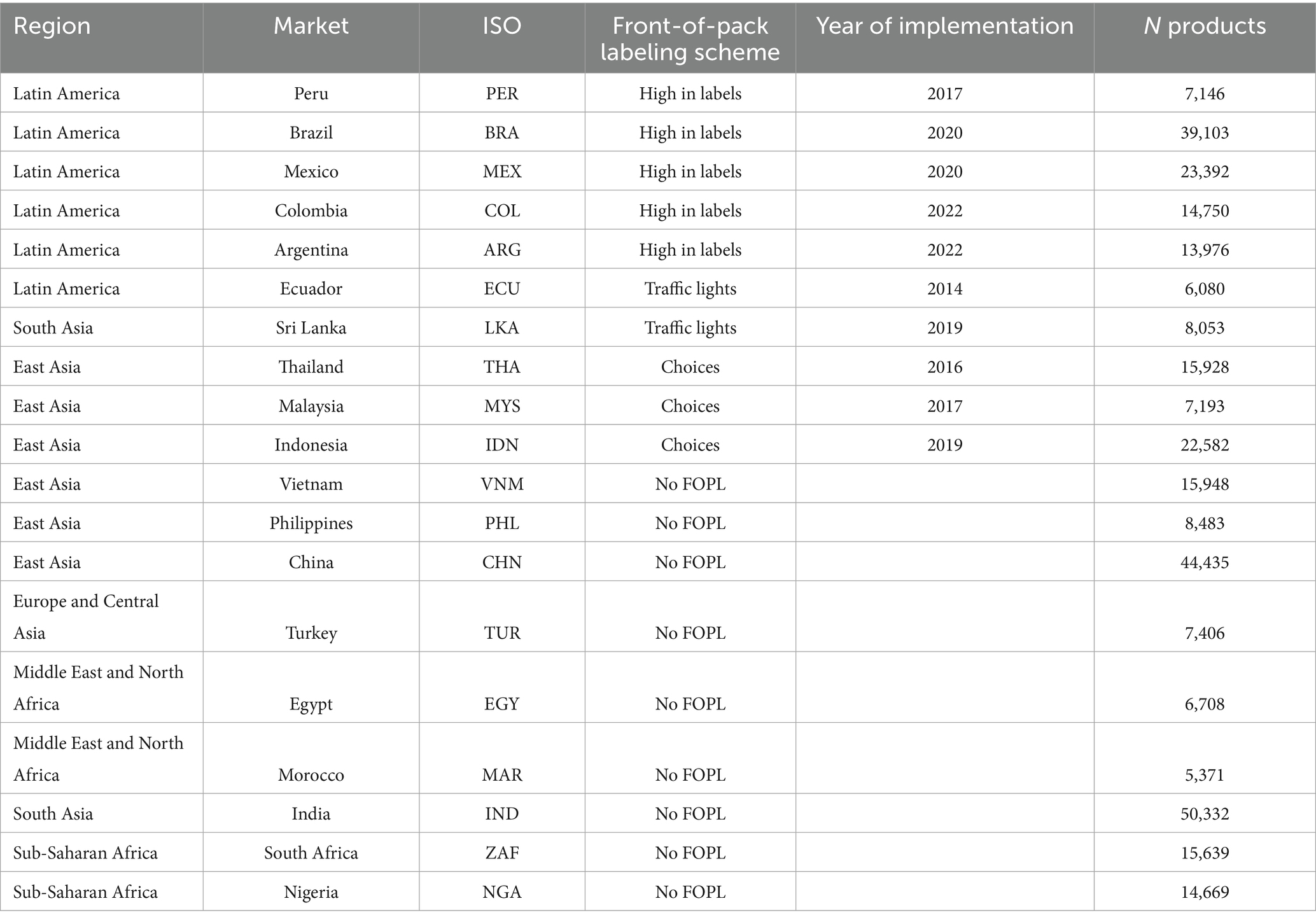 A subset of Mintel GNPD featuring packaged food products launched from 2015 to 2023 in 19 LMICs was extracted. Countries were classified using the World Bank 2023 classification by region and income (23). A LMIC was selected if information was available for more than 1,000 products every year in Mintel GNPD (Table 1). The presence or absence of a FOPL scheme was determined based on a recent systematic review of nutrient profiling models supporting food policies in LMICs (6). Three FOPL have been implemented in the countries considered: High In labels, Traffic Light schemes and Choices schemes. High In labels are a type of mandatory FOPL implemented across most Latin American LMICs and more recently in South Africa. They convey negative messaging by framing in black nutrients present in excess (12). Traffic Lights schemes are implemented in Ecuador and Sri Lanka and deliver a mixed message by coloring nutrient in red if their content is high, yellow if moderate and green if low (6). The Choices scheme, implemented mainly in South Asia, highlights the healthiest options per food category with a logo (6). Since High In labels were implemented in South Africa in 2023 (24), they could not have had an impact on nutritional quality from 2015 to 2022 and therefore South Africa was not considered in this analysis.