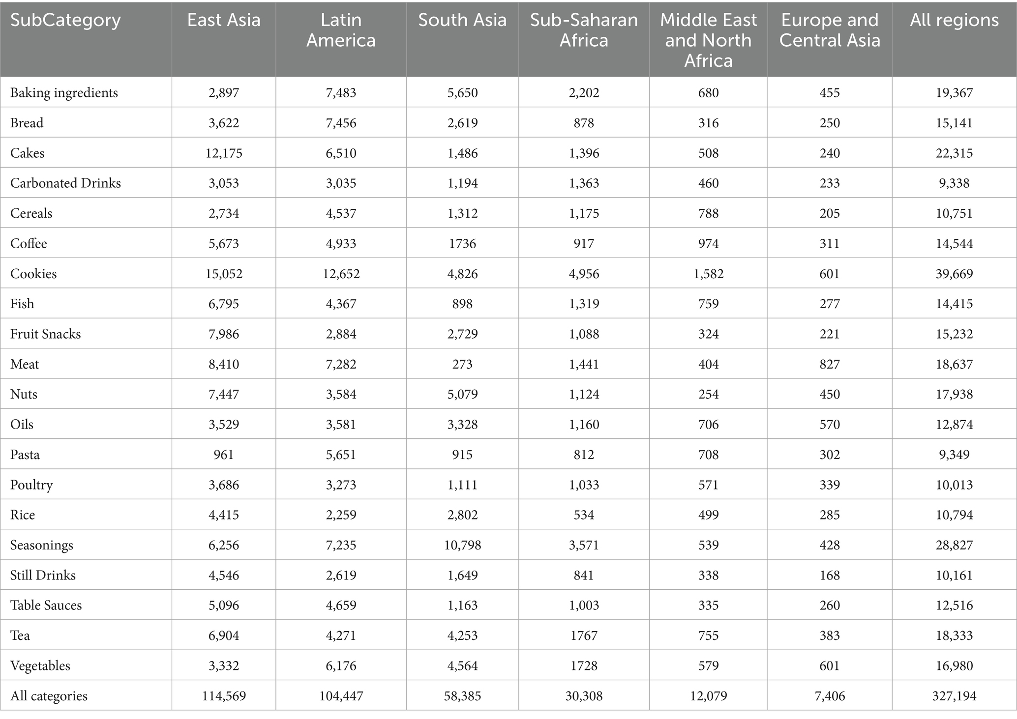 Food categories were selected based on the percentage of products per category for each LMIC and averaged across countries. Only the top 20 categories were selected for further analysis (Table 2). These foods represent each more than 1.5% of the food supply summing to nearly half of newly launched packaged foods in LMICs. A total of 327′194 packaged food products were included in the final dataset.