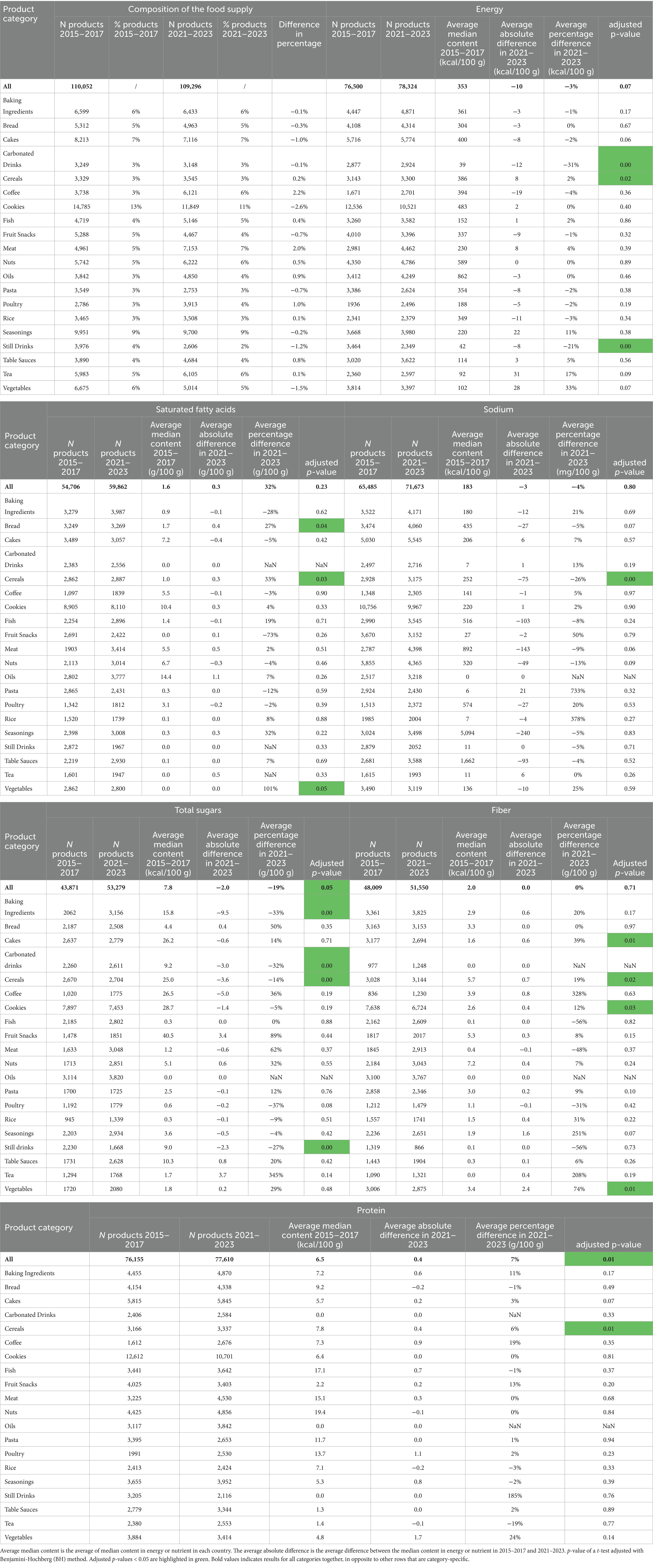 Change of the number of products in each food category and the nutritional quality of the packaged food supply was evaluated by comparing the number and median nutrient content of the five nutrients of interest by country and category, in 2015–2017 and 2021–2023. Median nutrient content was selected over mean to give more importance to central values than to extreme ones in each category. Percentage of products and median nutrient content by category were averaged across countries to identify category-specific changes. A t-test was used for comparison between the two time periods, with Benjamini-Hochberg (BH) correction to account for multiple testing (α = 5%).