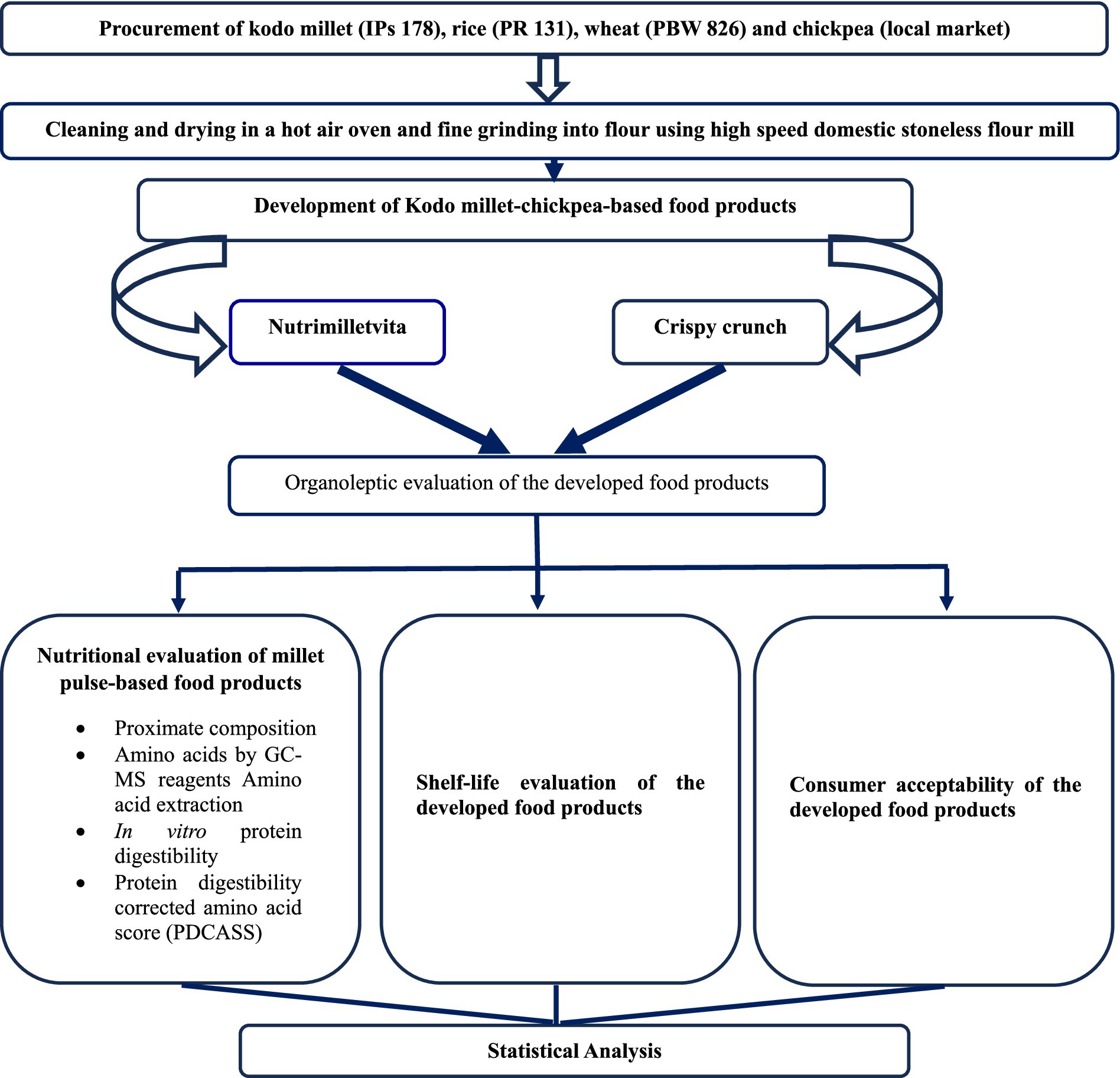 Flowchart illustrating the process of developing Kodo millet-chickpea-based food products. It begins with procuring ingredients and processing them into flour. Two products, Nutrimilletvita and Crispy Crunch, are evaluated organoleptically, nutritionally, and for shelf-life and consumer acceptability. Statistical analysis follows.