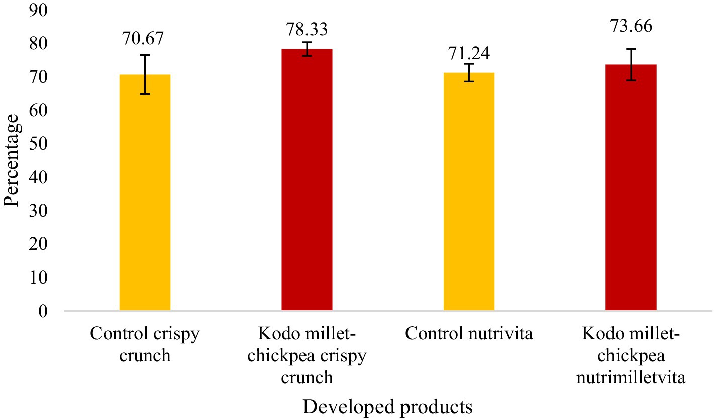 Figure 2. Consumer acceptability of Kodo millet–chickpea crispy crunch and nutrimilletvita (100 g, dry weight basis).