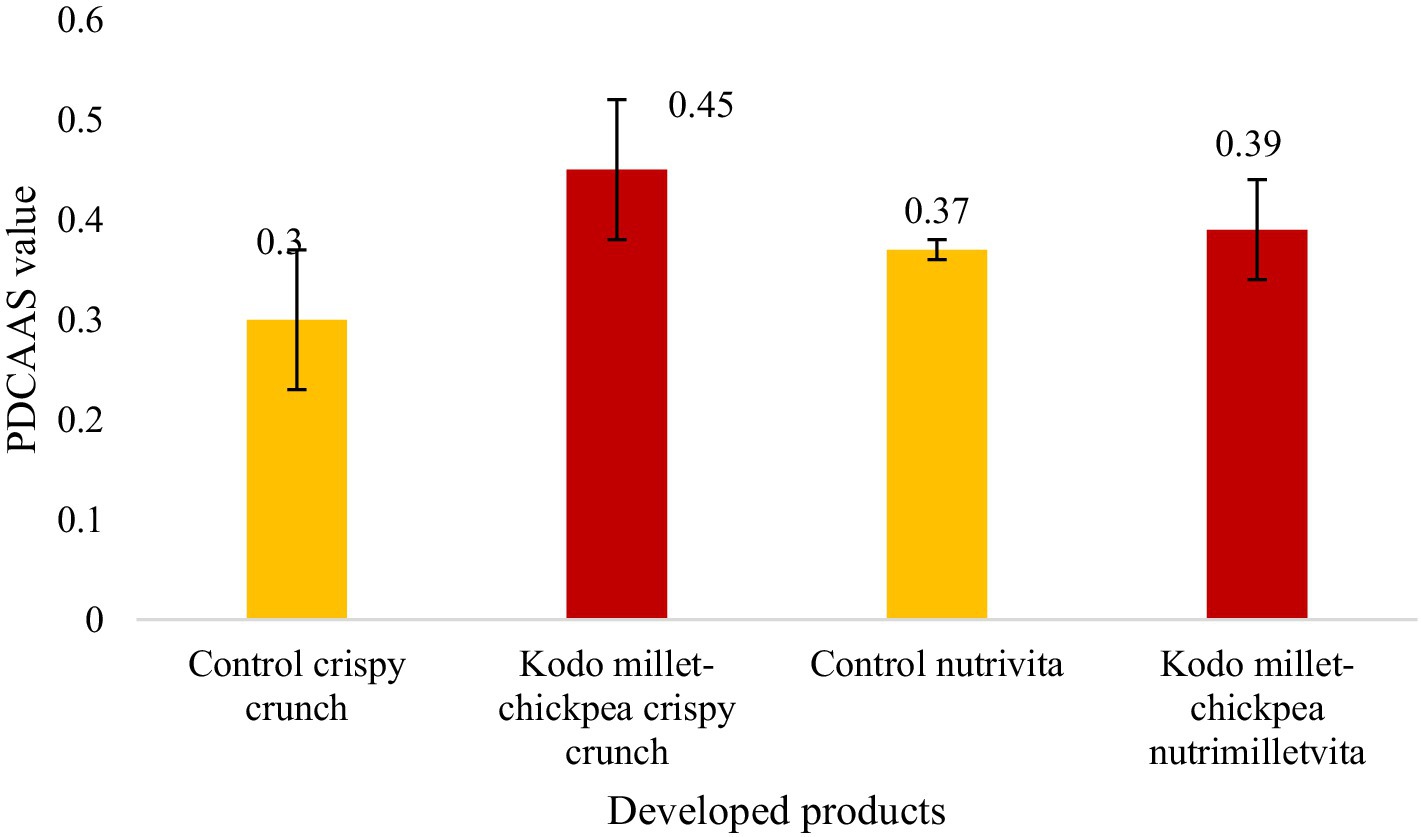 Bar chart comparing PDCAAS values of different developed products. Control crispy crunch scores 0.3, Kodo millet-chickpea crispy crunch scores 0.45, Control nutrivita scores 0.37, and Kodo millet-chickpea nutrimilletvita scores 0.39. Error bars are present for each product.