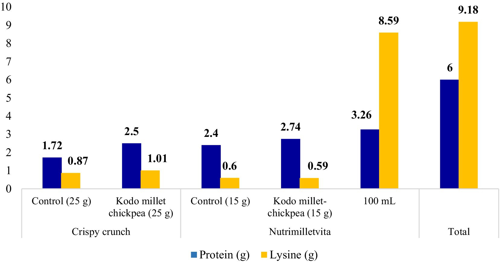 The millet pulse-based product has been developed for school-going children, so it is important to know the amount of nutrients on a per serving basis. The developed food products were found to be rich in protein and lysine based on their one portion in comparison to their control counterparts. Hence, consumption of one portion of the millet pulse–based developed in the current study can help in combating protein malnutrition and improving protein quality in the country. Evidence emphasized that adding pulses to millet-based food increases both protein and lysine content (54).
